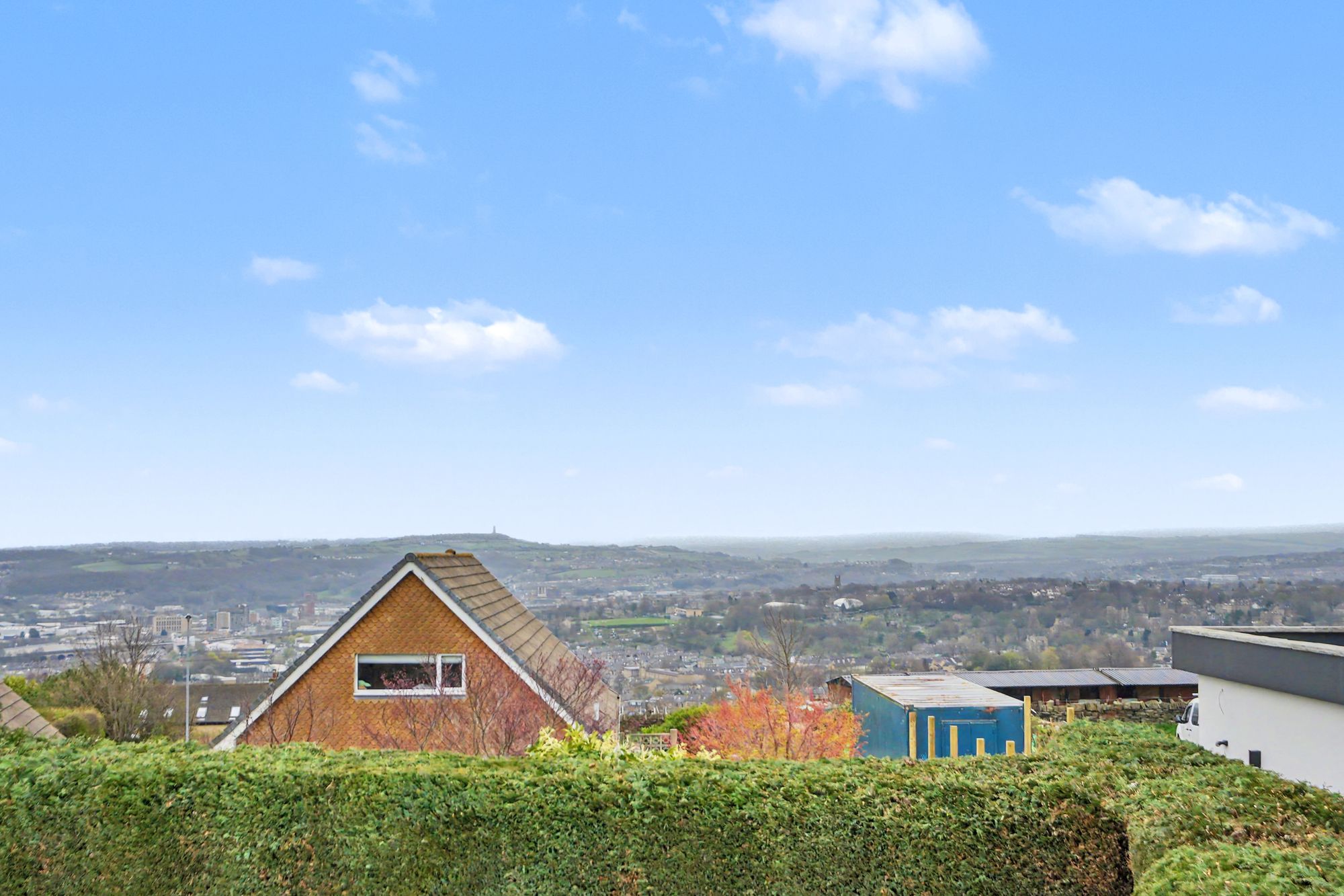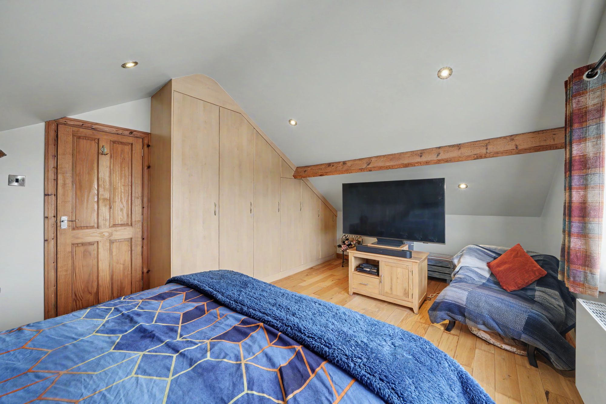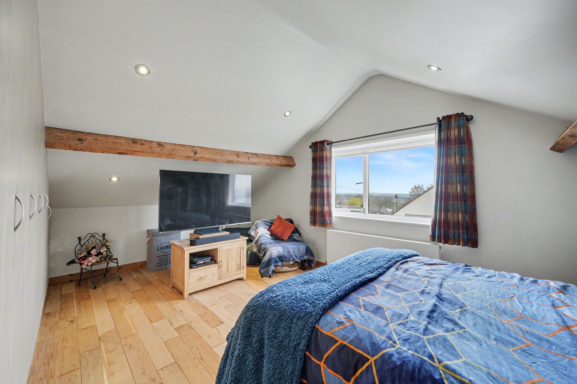 Another good-sized room which has a uPVC double glazed window to the gable with far reaching views across Huddersfield with Emley Moor Mast to one side. There is a pitched beamed ceiling with inset LED downlighters, oak flooring, central heating radiator and a bank of fitted floor to ceiling wardrobes and cupboards.