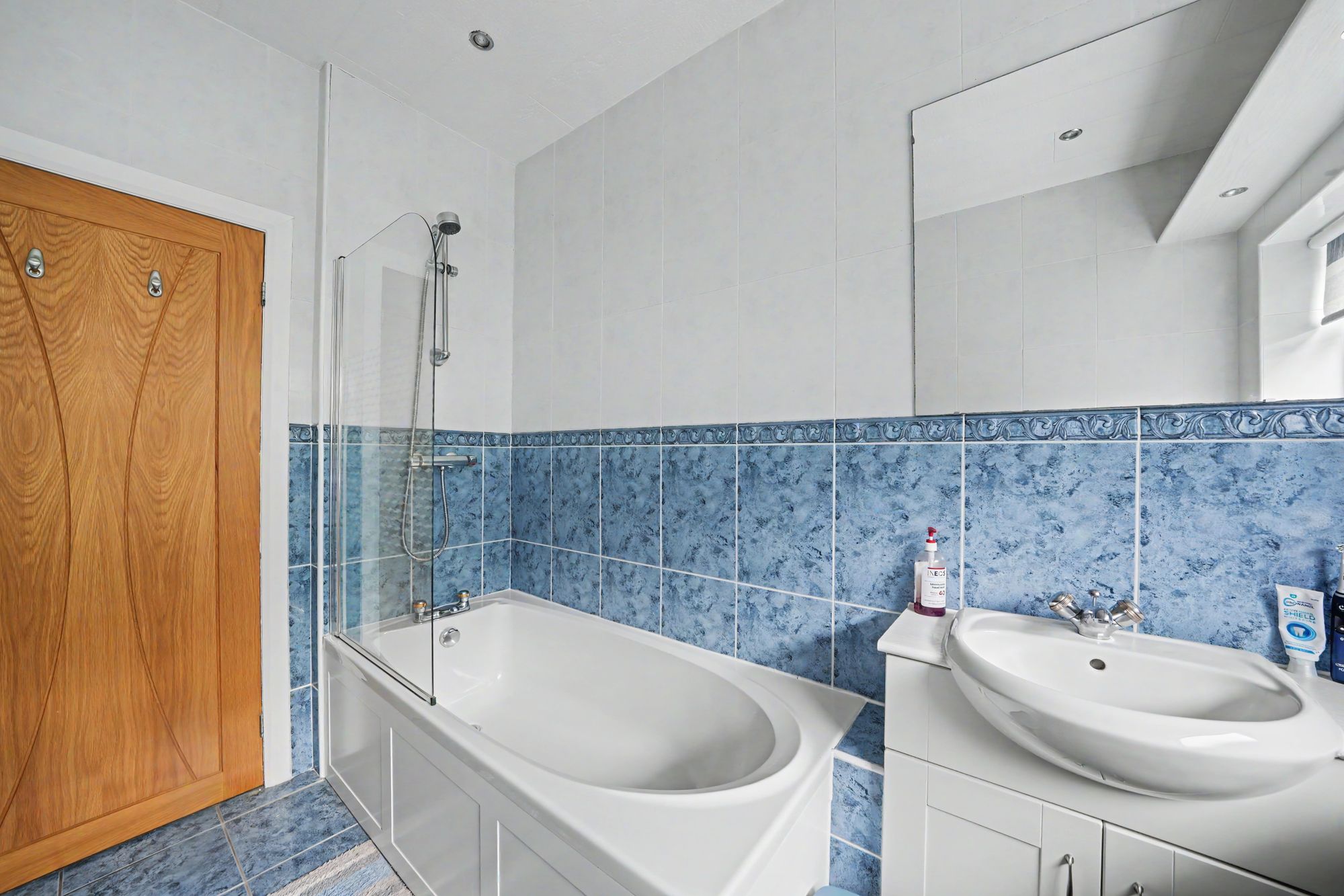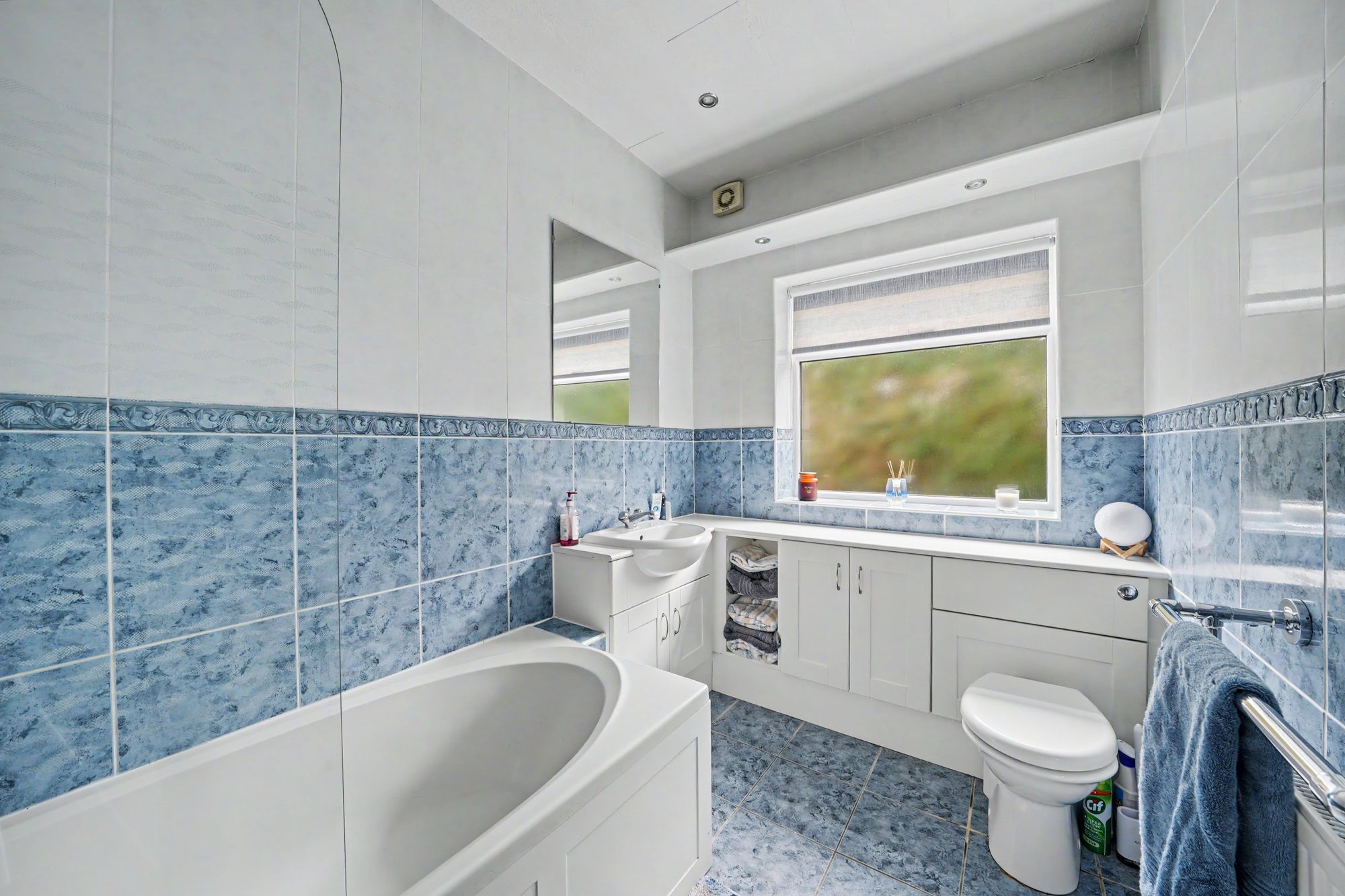 With a frosted uPVC double glazed window, inset LED downlighters, pelmet downlighters, floor to ceiling tiled walls, tiled floor with under floor heating, chrome heated towel rail incorporating radiator and fitted with a suite comprising vanity unit incorporating wash basin and low flush w.c with concealed cistern together with a panelled bath with glazed shower screen and chrome shower fitting over.