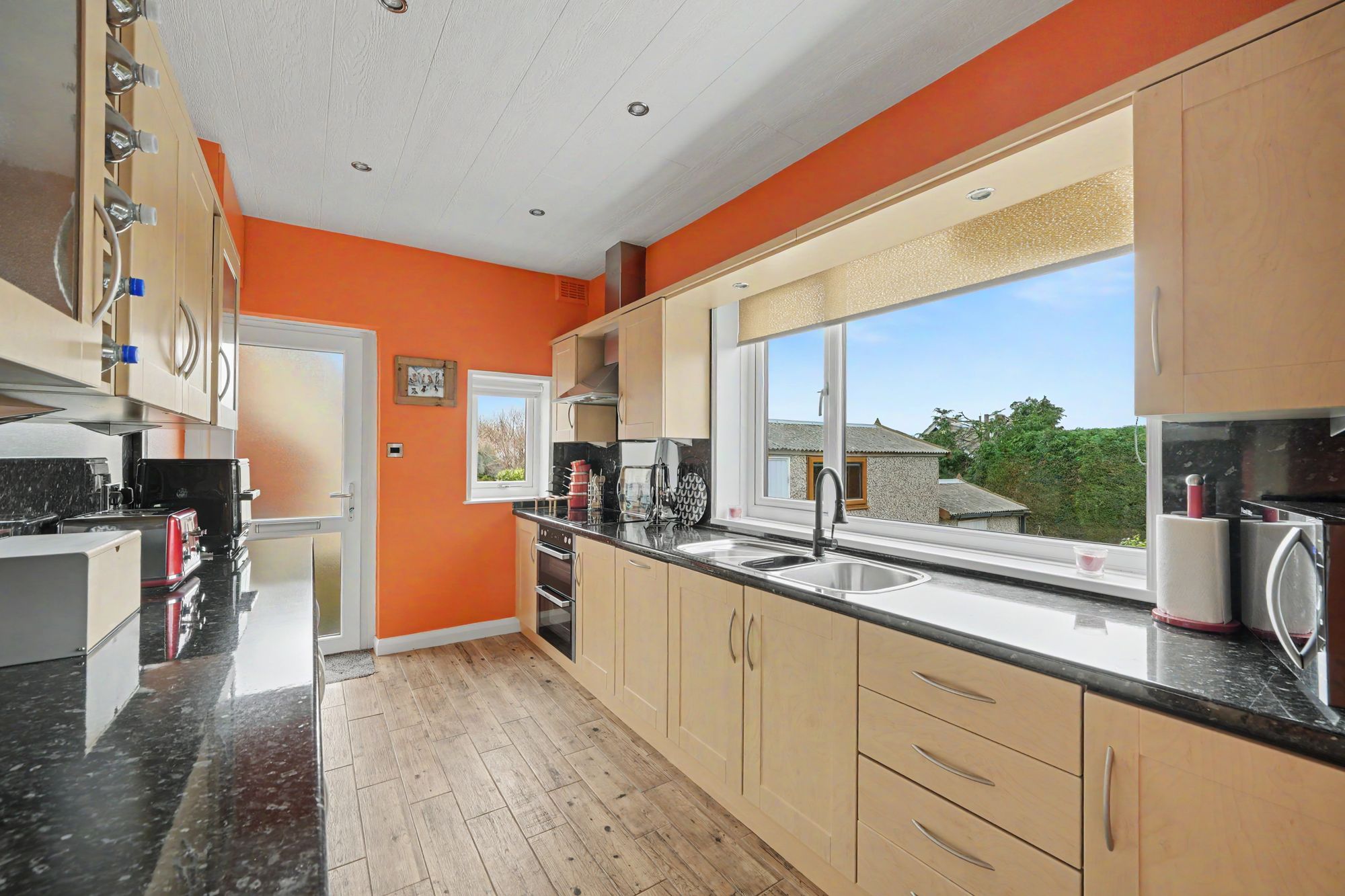 This is situated adjacent to the sitting room and as such enjoys a similar aspect through a uPVC double glazed window across the south facing rear garden. Additional natural light comes from a uPVC double glazed window to the side elevation with adjacent uPVC and frosted double glazed door. There are inset LED downlighters, there is a tiled oak effect floor with underfloor heating and fitted with a range of shaker style base and wall cupboards, drawers, contrasting overlying worktops with matching splashbacks, inset one and a half bowl single drainer sink with an extending monobloc tap, four ring induction hob with stainless steel extractor hood over and stainless steel electric double oven beneath, integrated slim line dishwasher, integrated washing machine, integrated fridge, integrated freezer, wine rack, pelmet downlighters and concealed lighting beneath the wall cupboards.
