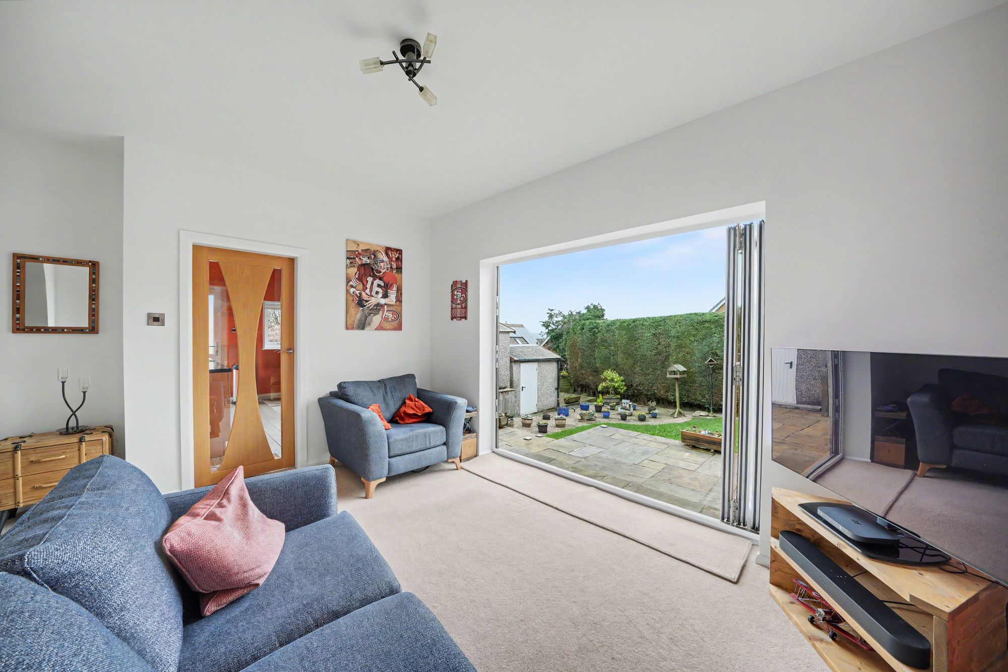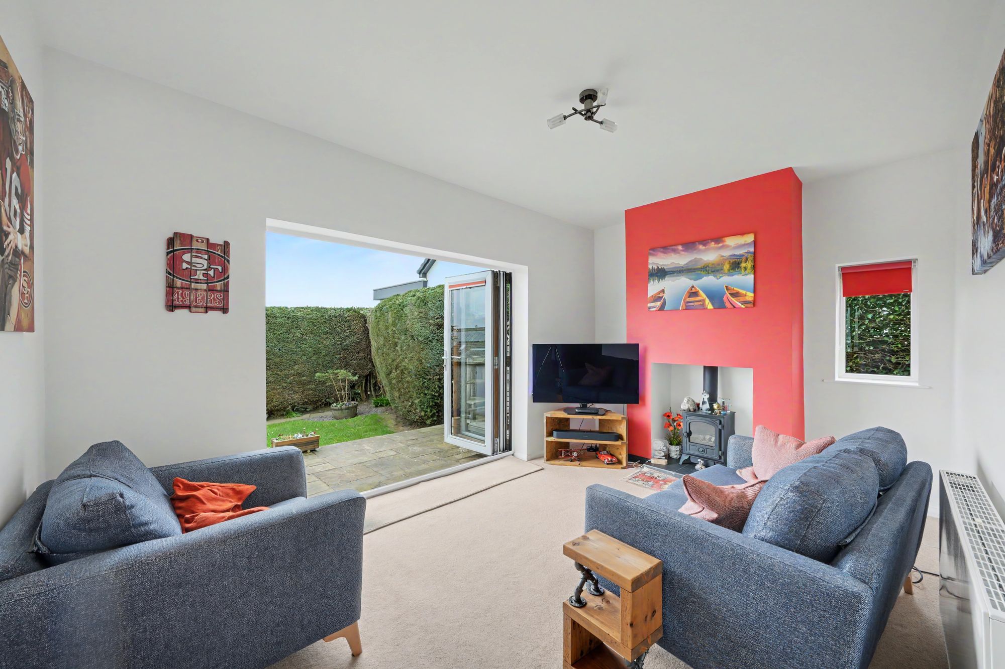 This is situated to the rear of the property and has three section uPVC double glazed bi-fold doors with integrated blinds and these provide the room with plenty of natural light as well as enjoying a southerly aspect across the garden with further natural light from a uPVC double glazed window to the side elevation. There is a ceiling light point, central heating radiator and housed within the chimney breast there is a coal effect gas stove which rests on a raised tiled hearth. To one side a timber and glazed door opens into the kitchen.