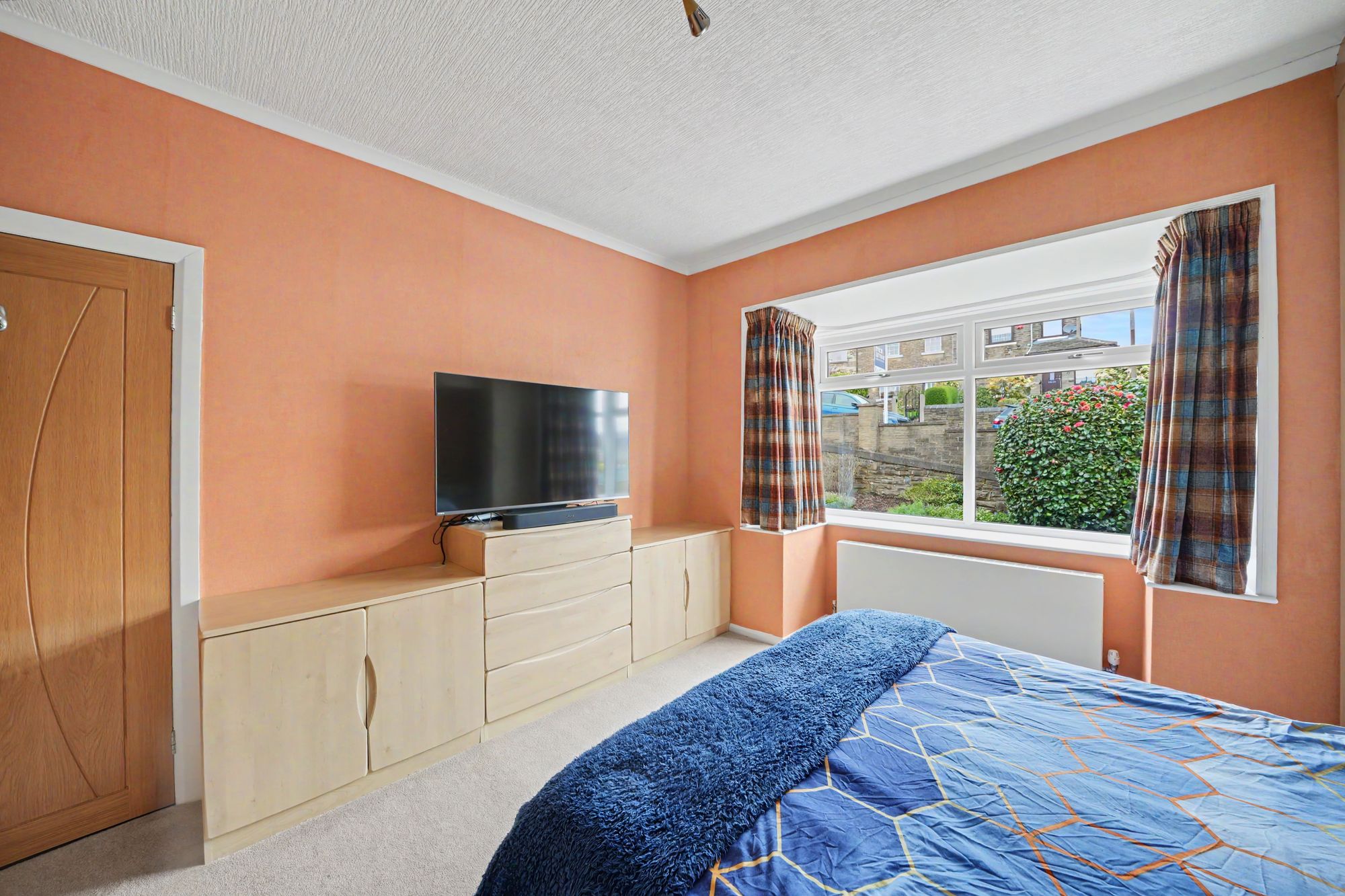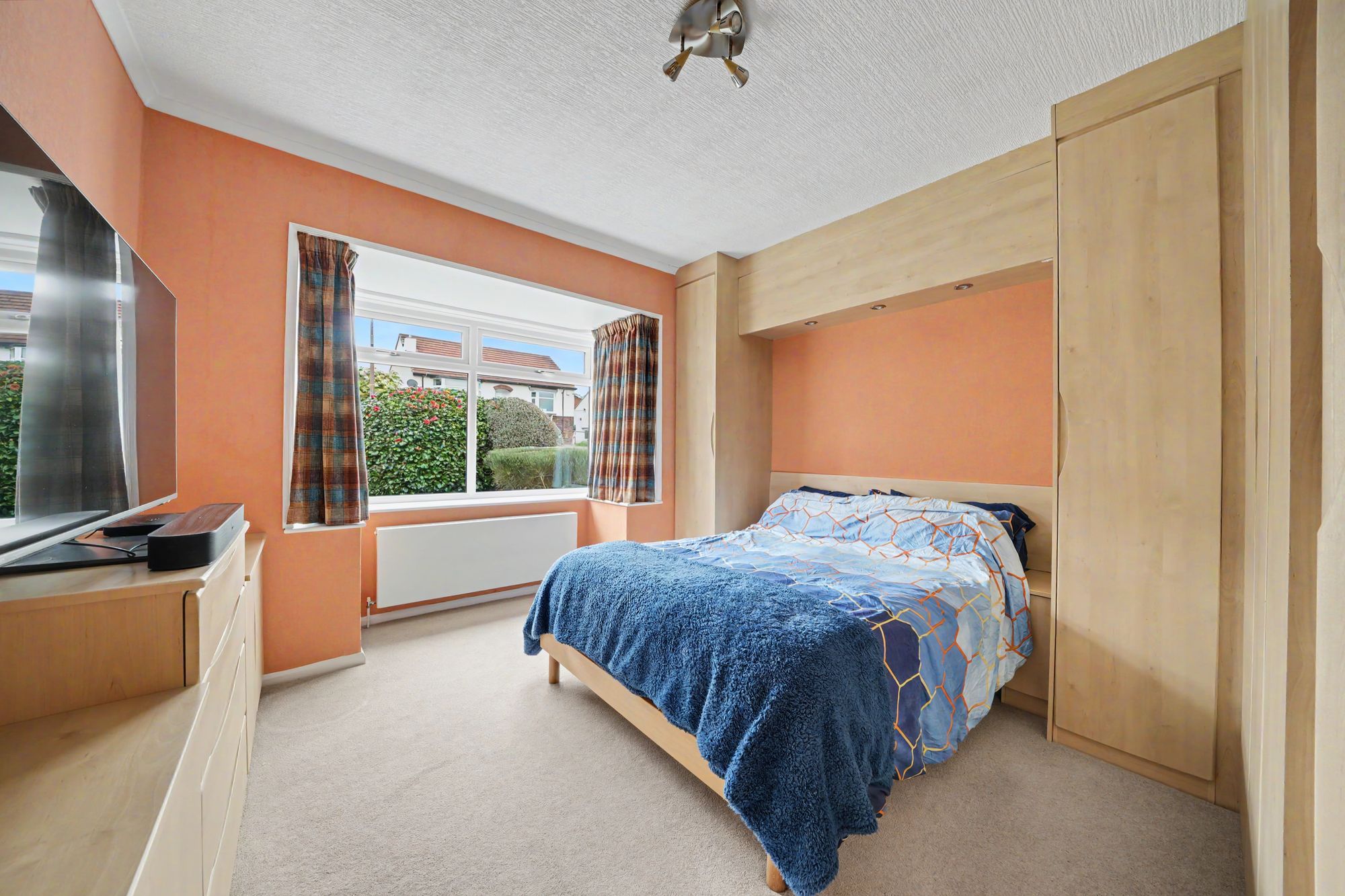 This has a walk-in bay with uPVC double glazed windows looking out across the front garden and with far reaching views to one side. There is a ceiling light point, ceiling coving, central heating radiator and a range of fitted furniture including floor to ceiling wardrobes, fitted bedhead and bedside tables with pelmet downlighters over and cupboards and drawers.