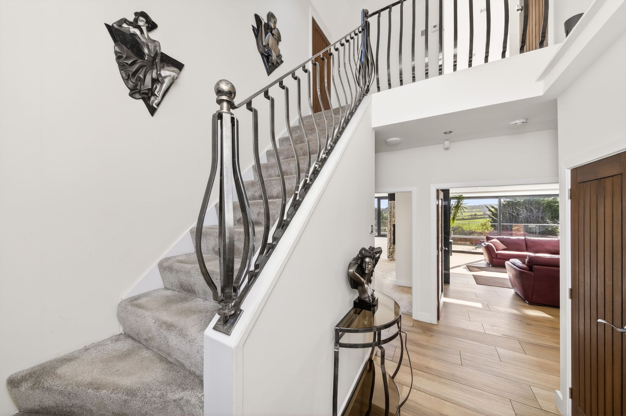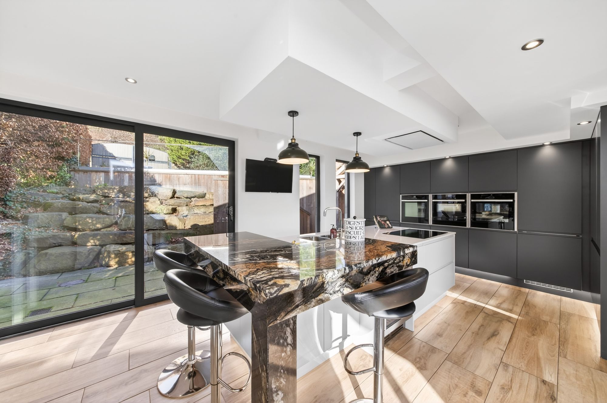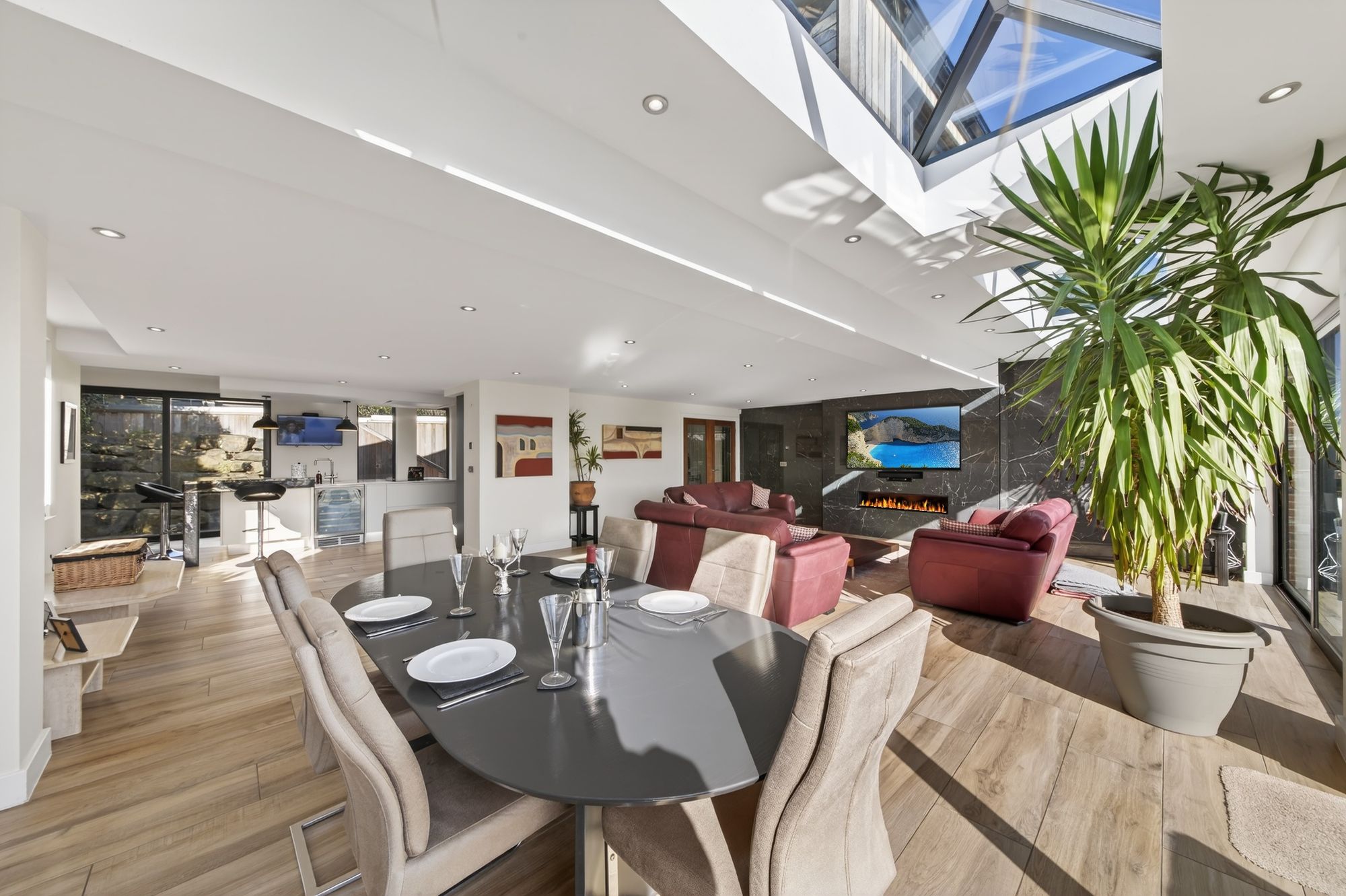 The focal point of the living area is the fabulous inbuilt media wall unit with attractive porcelain tiled feature wall with inset remote controlled fireplace with LED back display, space for a wall mounted flat screen television as well as recesses for the sound bar and further peripherals.