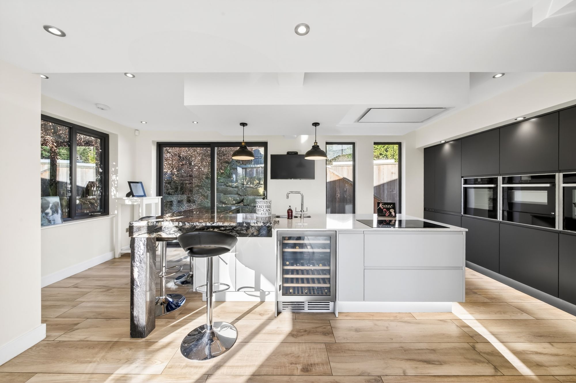 The kitchen features a wide range of high quality fitted wall and base units with handleless contrasting cupboard fronts and complimentary quartz and marble work surfaces above which incorporate a one and a half bowl stainless steel inset sink and drainer unit with chrome boiling hot water tap and inset incinerator. The kitchen is well equipped with high quality built in Neff appliances including a five ring ceramic induction hob with ceiling mounted extraction, twin slide and hide waist level ovens, a microwave combination oven with warming drawer, integrated fridge and freezer units and a built in Caple wine fridge. The kitchen benefits from soft closing doors and drawers, pull out pantry cupboards, cornice inset spotlighting as well as LED footwell lighting. The centrepiece of the kitchen area is the fabulous breakfast island with ample cupboards beneath and fantastic views from the aluminium patio doors to the front onto the front courtyard and driveway.