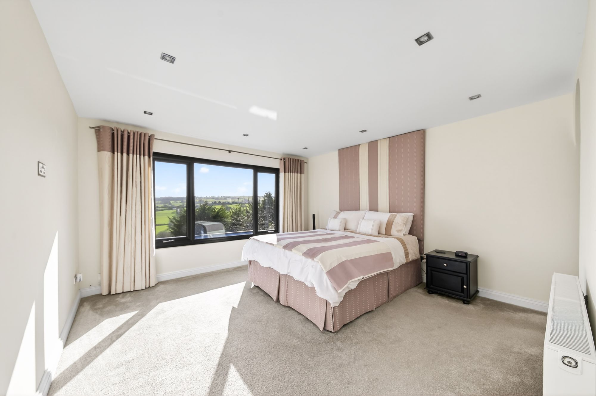 The walk in wardrobe has ample space for either free standing or fitted furniture. There are two hanging rails in situ, high quality flooring and a ceiling light point.
