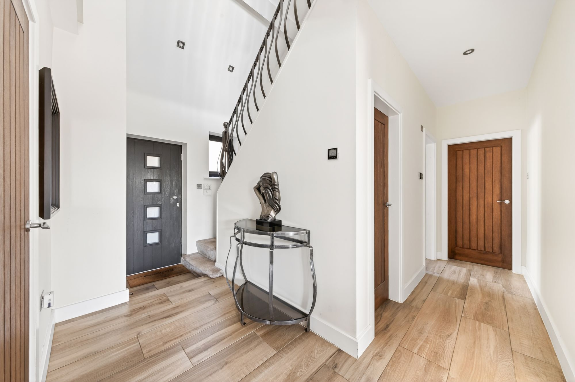 Enter into the property through a multipaneled double glazed composite front door with obscure glazed inserts into the entrance hall. The entrance hall is most impressive with vaulted ceiling and a kite winding staircase leading to a galleried landing. There is a double glazed window and skylight window to the front elevation providing a wealth of natural light as well as timber and glazed doors leading into the open plan dining kitchen and family room. There is attractive tiled flooring, inset spotlighting to the ceiling and oak doors providing access to the cloaks cupboard, luxury ground floor shower room, two well-proportioned bedrooms, the open plan dining kitchen and family room and enclosing a useful understairs cupboard which holds the manifold for the under floor heating system.