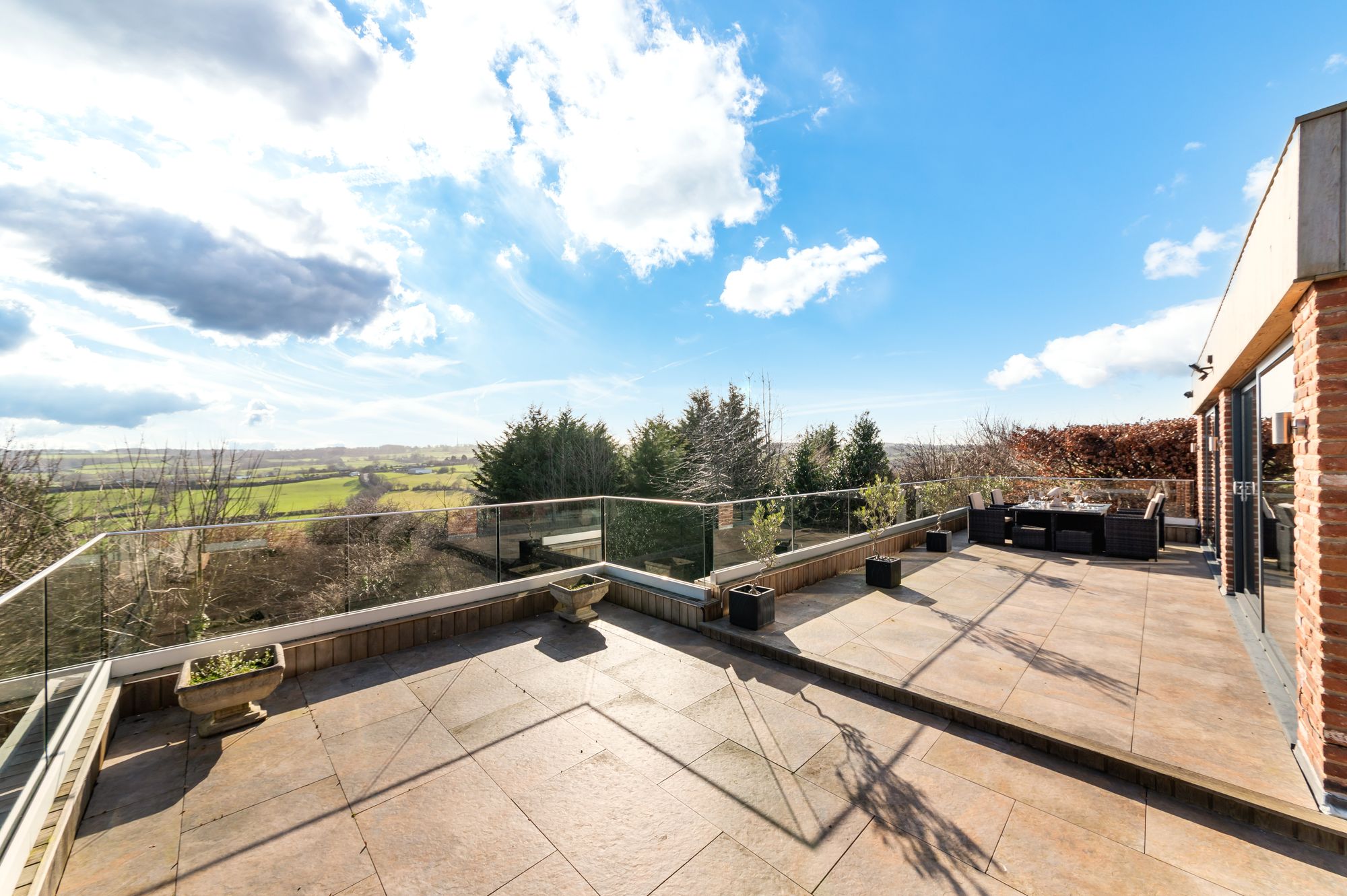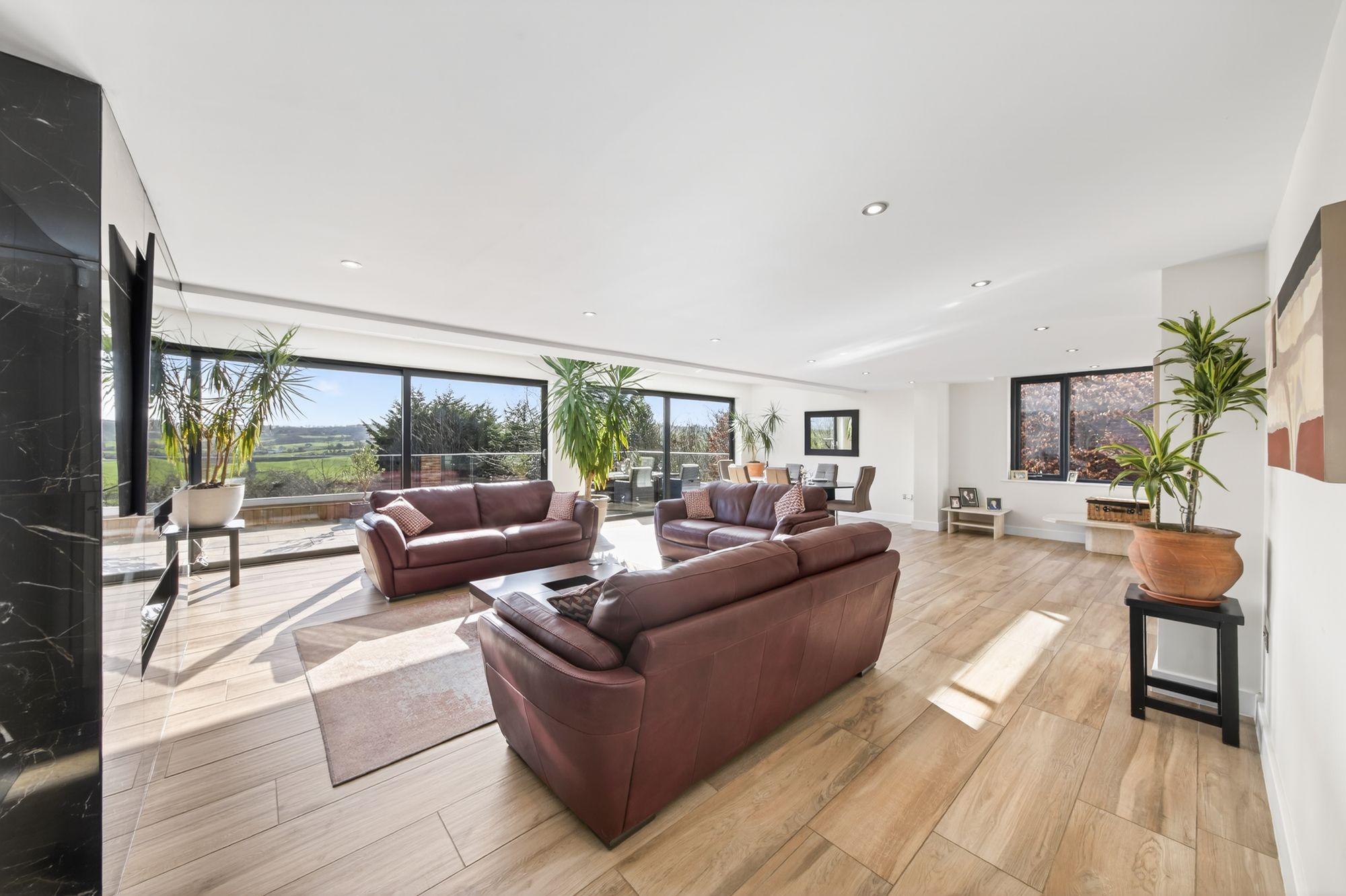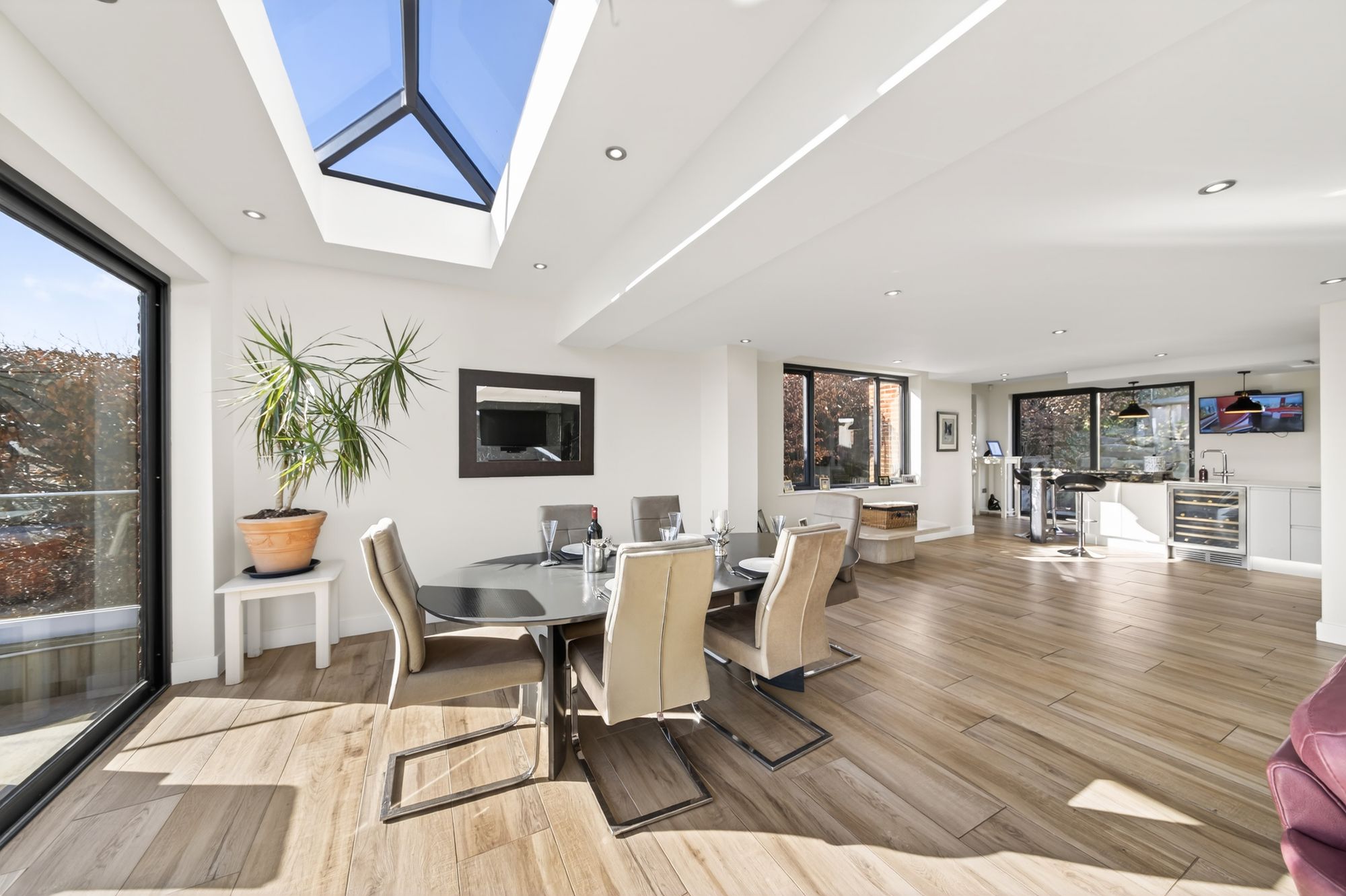 OPEN PLAN DINING KITCHEN AND FAMILY ROOMA most impressive light and airy, generously proportioned reception room enjoying the wealth of natural light with triple aspect windows, a bank of windows to the front elevation as well as sliding patio doors from the kitchen area with two banks of windows to the side and fabulous twin patio doors to the rear elevation giving seamless access to the terrace. The twin patio doors provide breathtaking panoramic views across the valley. There are two roof lanterns with inset spotlighting and the attractive tiled flooring with underfloor heating continues through from the entrance hall.