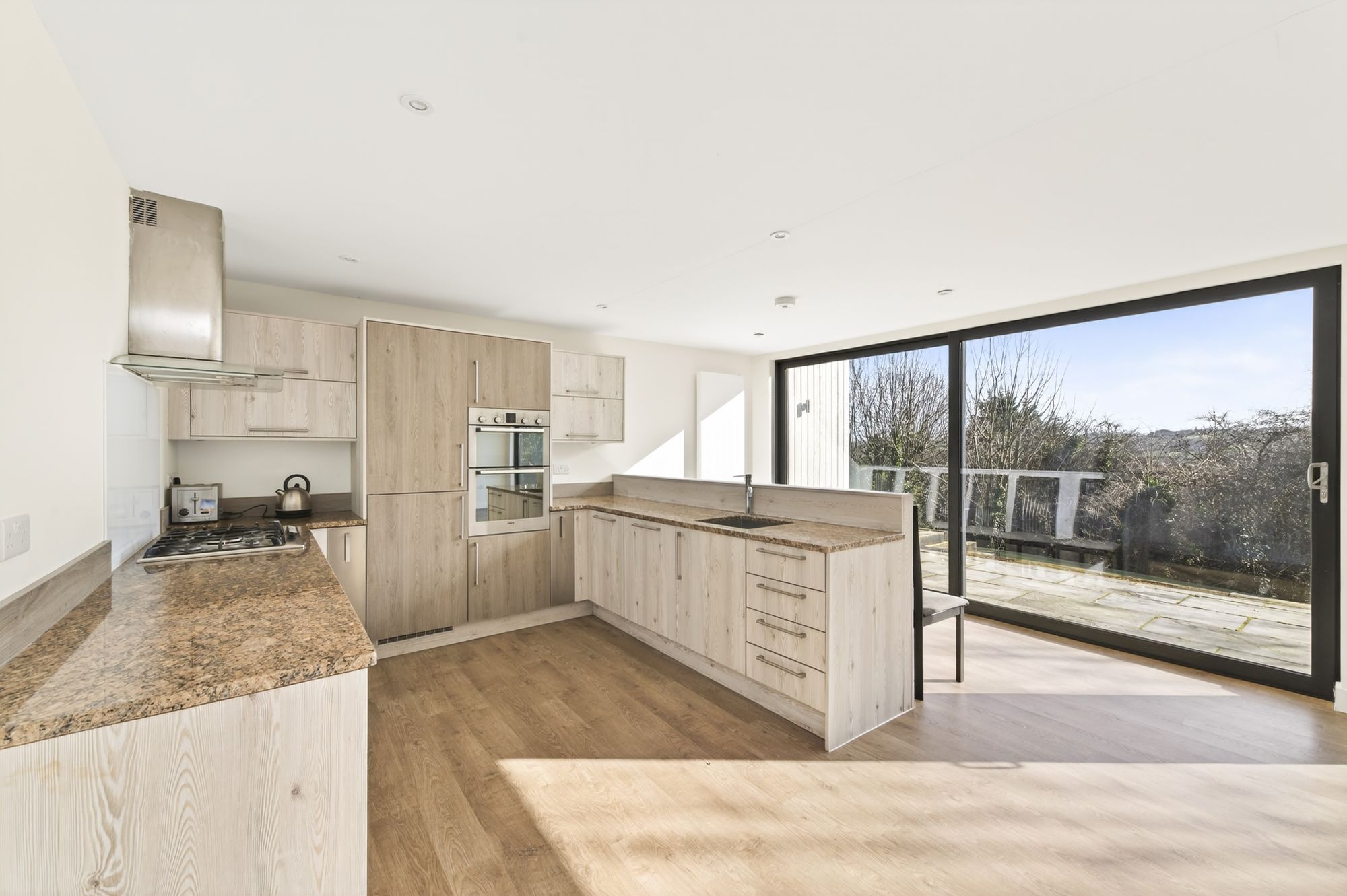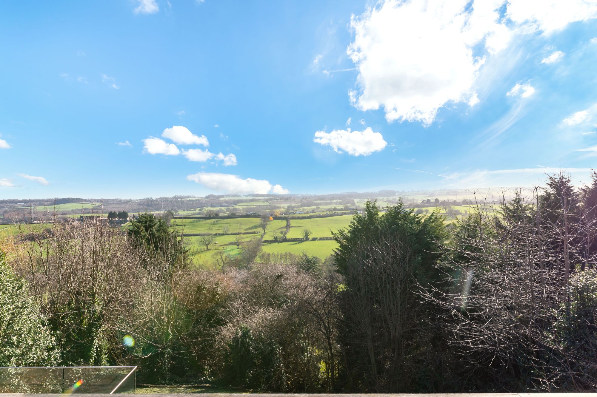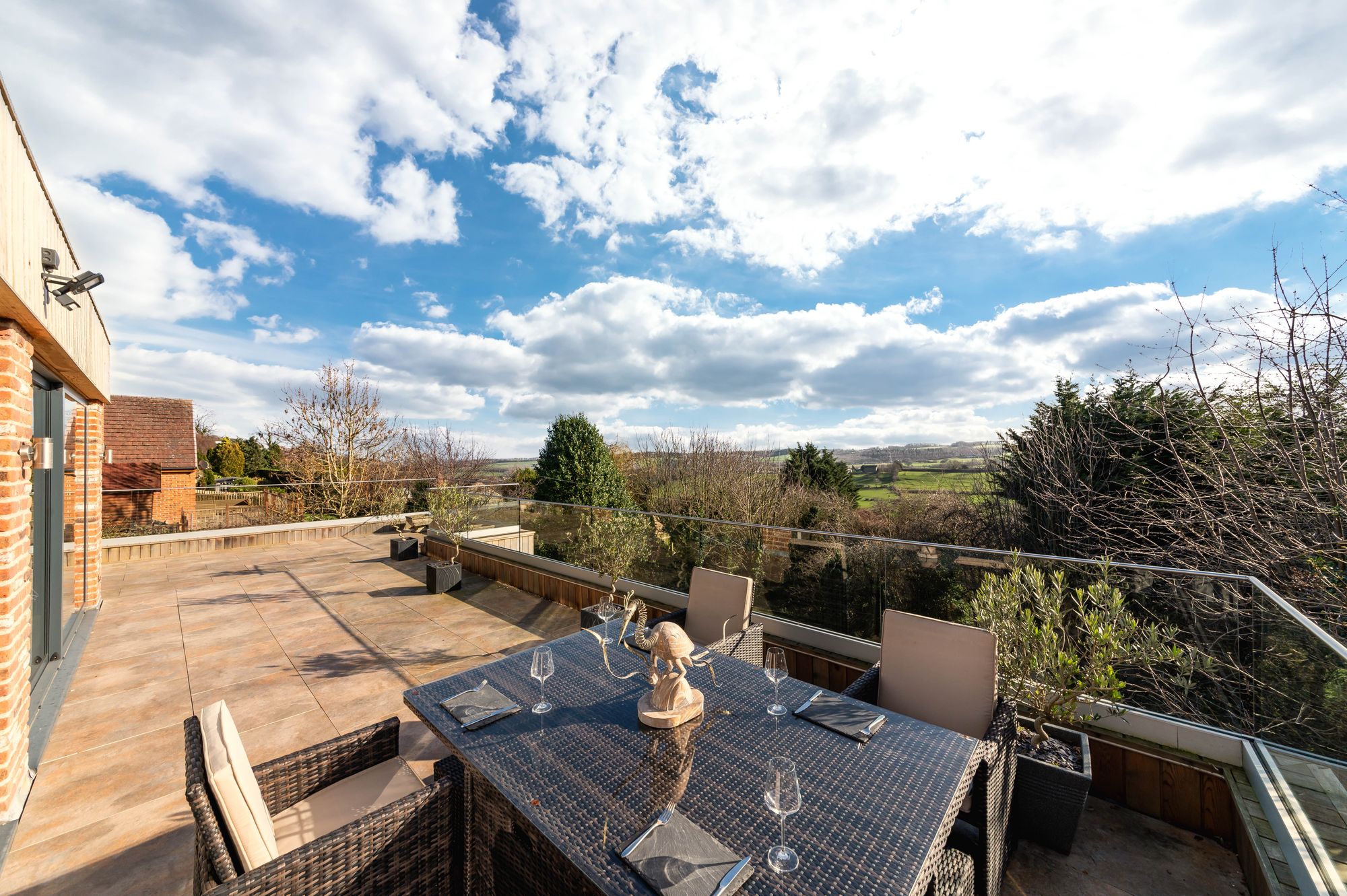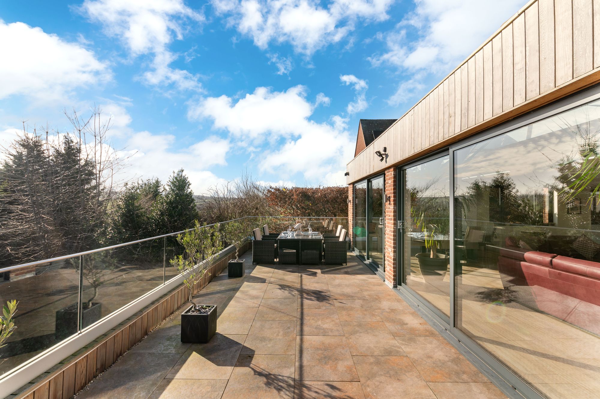 OPEN PLAN DINING KITCHEN AND FAMILY ROOMA most impressive light and airy, generously proportioned reception room enjoying the wealth of natural light with triple aspect windows, a bank of windows to the front elevation as well as sliding patio doors from the kitchen area with two banks of windows to the side and fabulous twin patio doors to the rear elevation giving seamless access to the terrace. The twin patio doors provide breathtaking panoramic views across the valley. There are two roof lanterns with inset spotlighting and the attractive tiled flooring with underfloor heating continues through from the entrance hall.