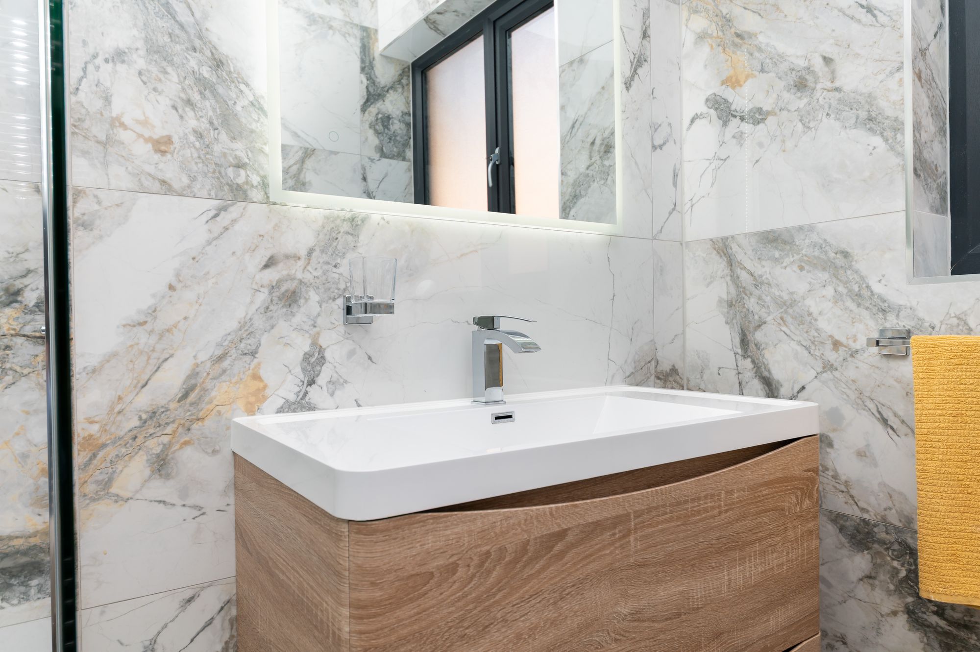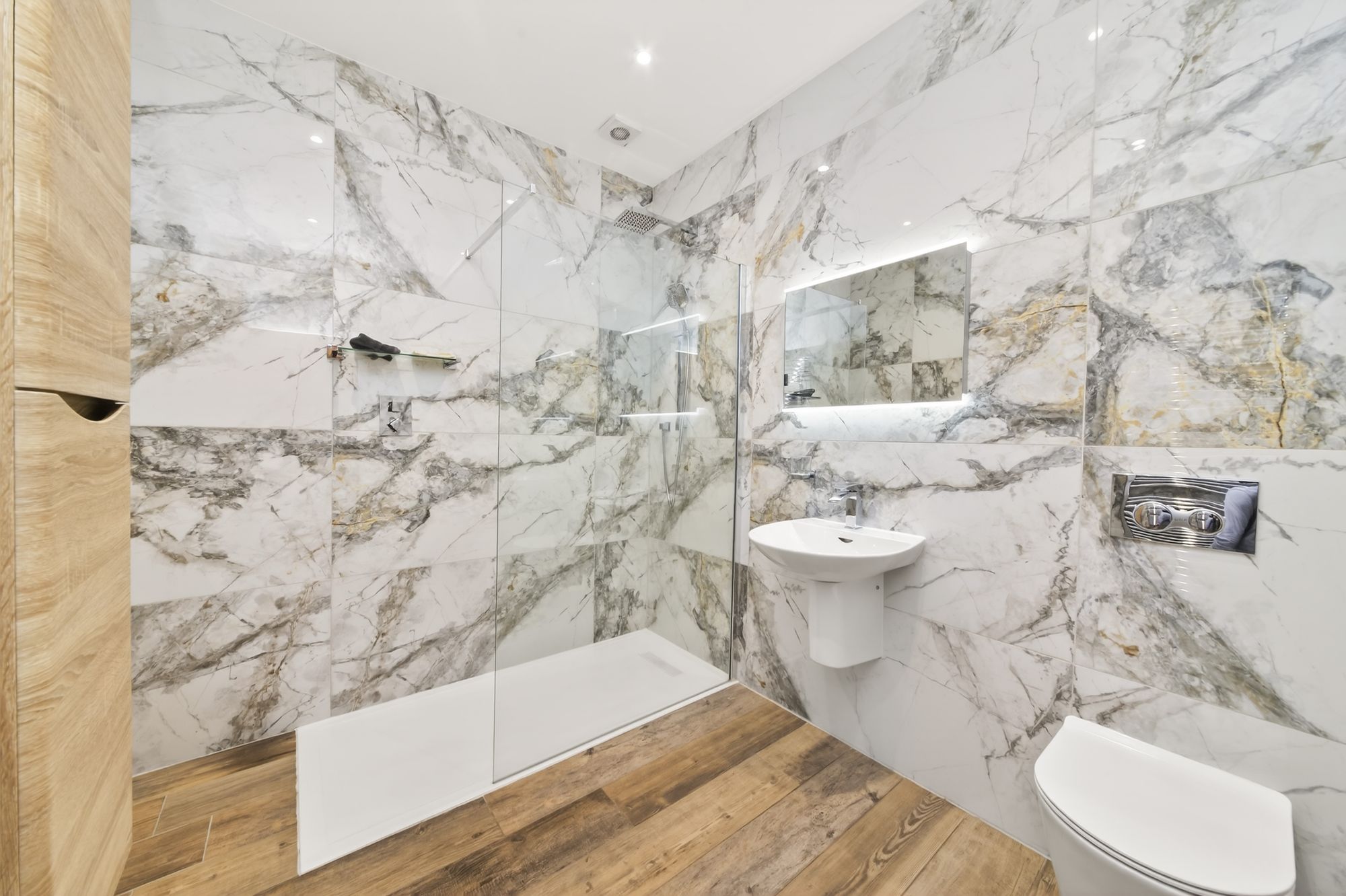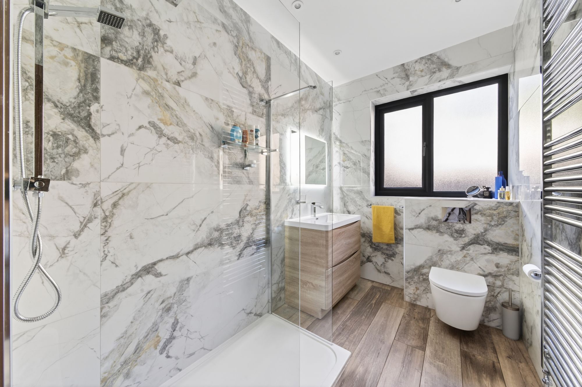 The shower room features a modern contemporary three piece suite which comprises of a low level W.C. with concealed cistern and push button flush, a broad wall hung wash hand basin with chrome monobloc mixer tap and a fixed frame walk in shower with thermostatic rainfall shower head and with separate handheld attachment. There is attractive timber style tiled flooring, beautiful marble effect porcelain tiled walls, inset spotlighting to the ceiling, an extractor and a chrome ladder style radiator.