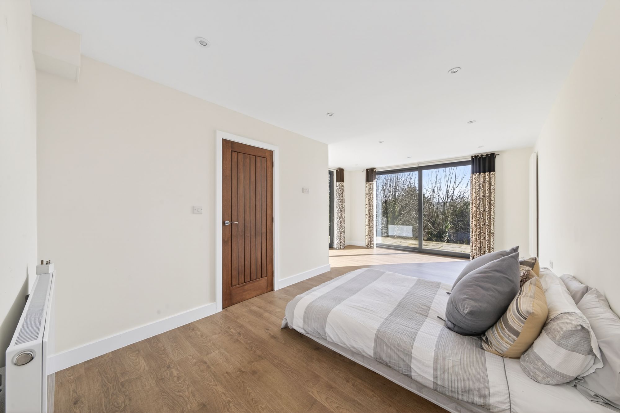 The annex bedroom enjoys a wealth of natural light with dual aspect windows, double glazed sliding patio doors to the rear elevation and a double glazed aluminium door to the side elevation with adjoining window. There is high quality flooring, inset spotlighting to the ceiling, a horizontal and vertical panel radiator and an oak door provides access to the walk in wardrobe.
