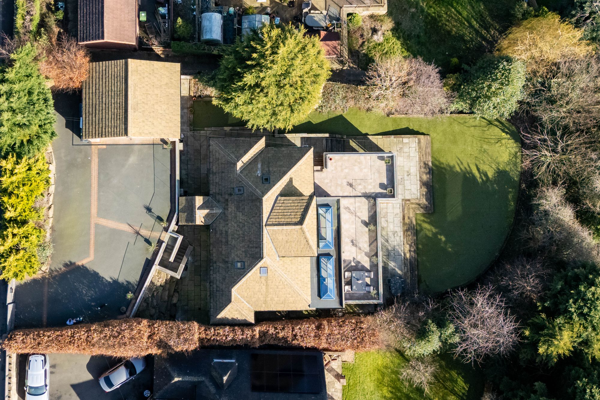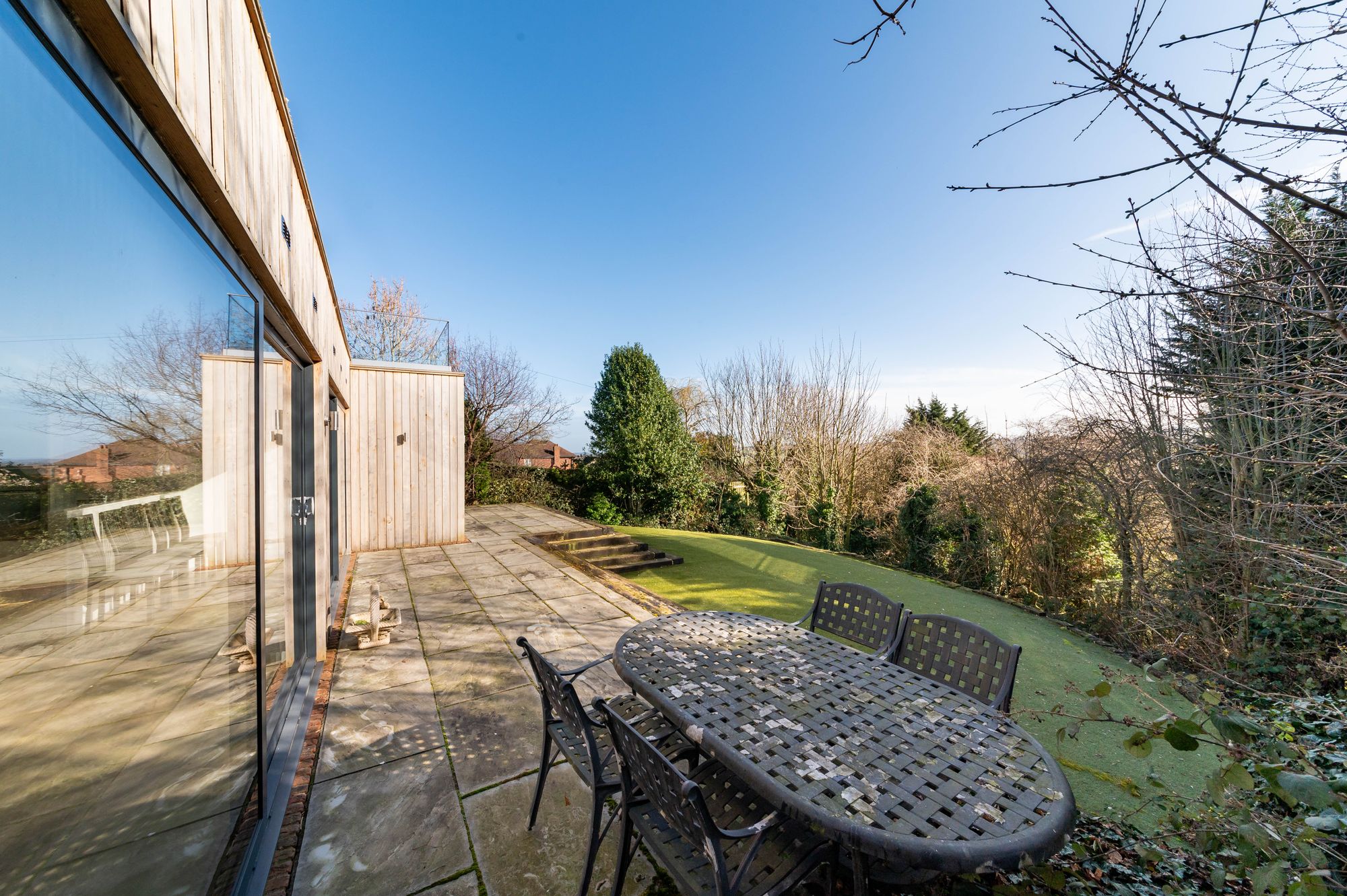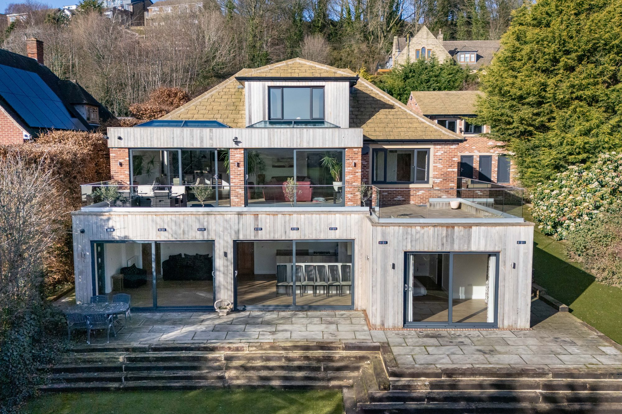 The property accommodation briefly comprises of entrance hall with vaulted ceiling, utility room, ground floor shower room, two good sized bedrooms and impressive open-plan dining-kitchen and family room with two banks of sliding patio doors leading out onto the sun terrace. To the first floor is the principal suite with walk-in wardrobe, generous double bedroom, luxury ensuite bathroom and walk-in closet/dressing room. To the lower ground floor is a self-contained annexe with open-plan dining-kitchen and living room, inner hallway, generous double bedroom which could be split into two good sized double rooms and finally the shower room. Externally there is a gated driveway leading to a courtyard and triple garage. The garaging has undercroft garden store cupboards beneath. The gardens to the rear feature substantial sun terrace, flagged patio and artificial lawn for low maintenance and a pleasant tree-lined outlook.