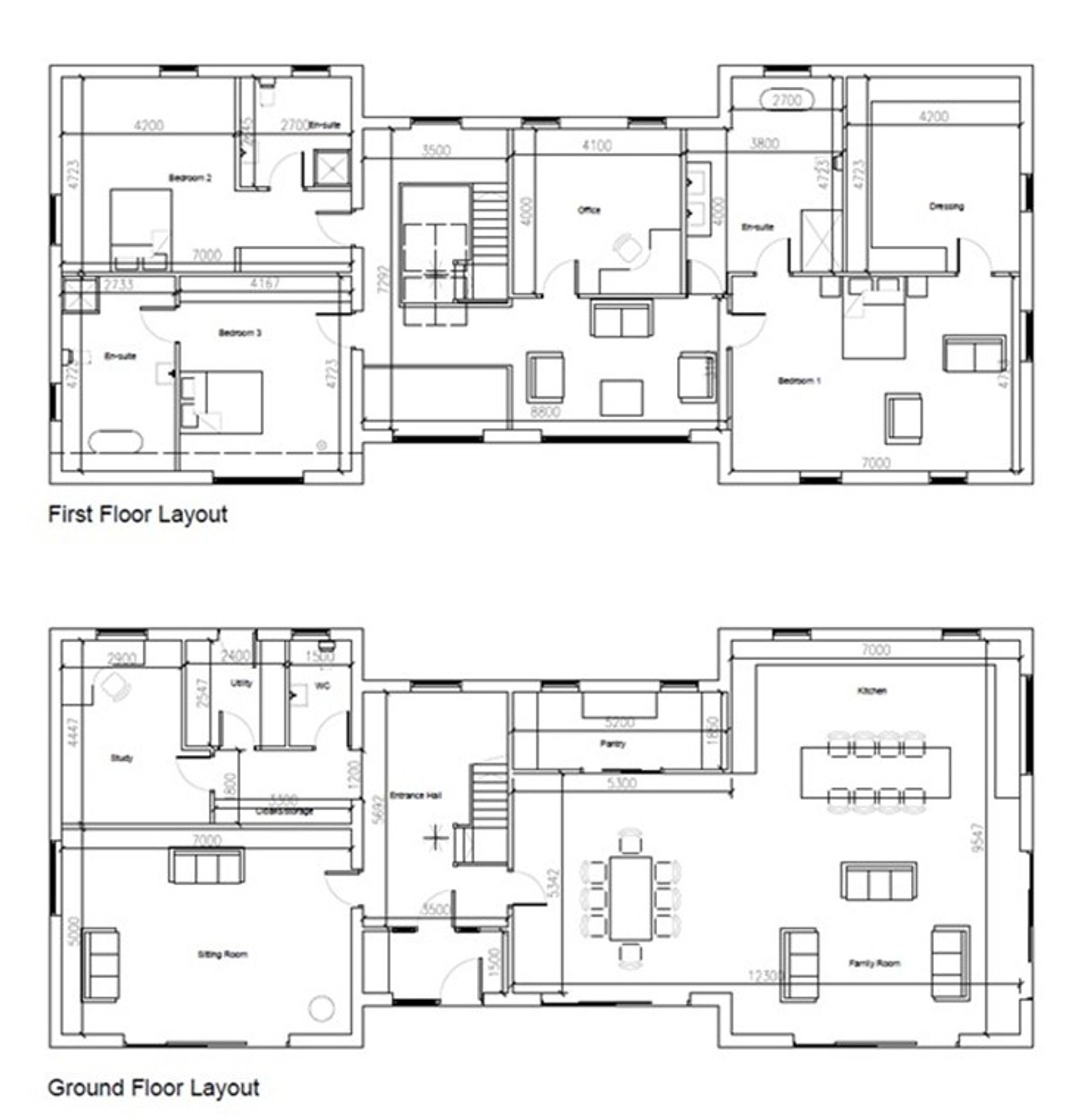 Entrance vestibule, fabulous entrance hallway, cloak room/W.C., huge dining living kitchen with family area/lounge, dining area and superb kitchen area. The measurements drawn show the dining kitchen being approximately 12.3m x 9.5m. A fabulous formal sitting room with stunning windows enjoying the views which is 7m x 5m, study/home office which measures 2.9m x 4.4m, large utility room and an impressive staircase rising to a fabulous first floor landing with study/sitting area. This gives access through to four extremely large bedrooms.