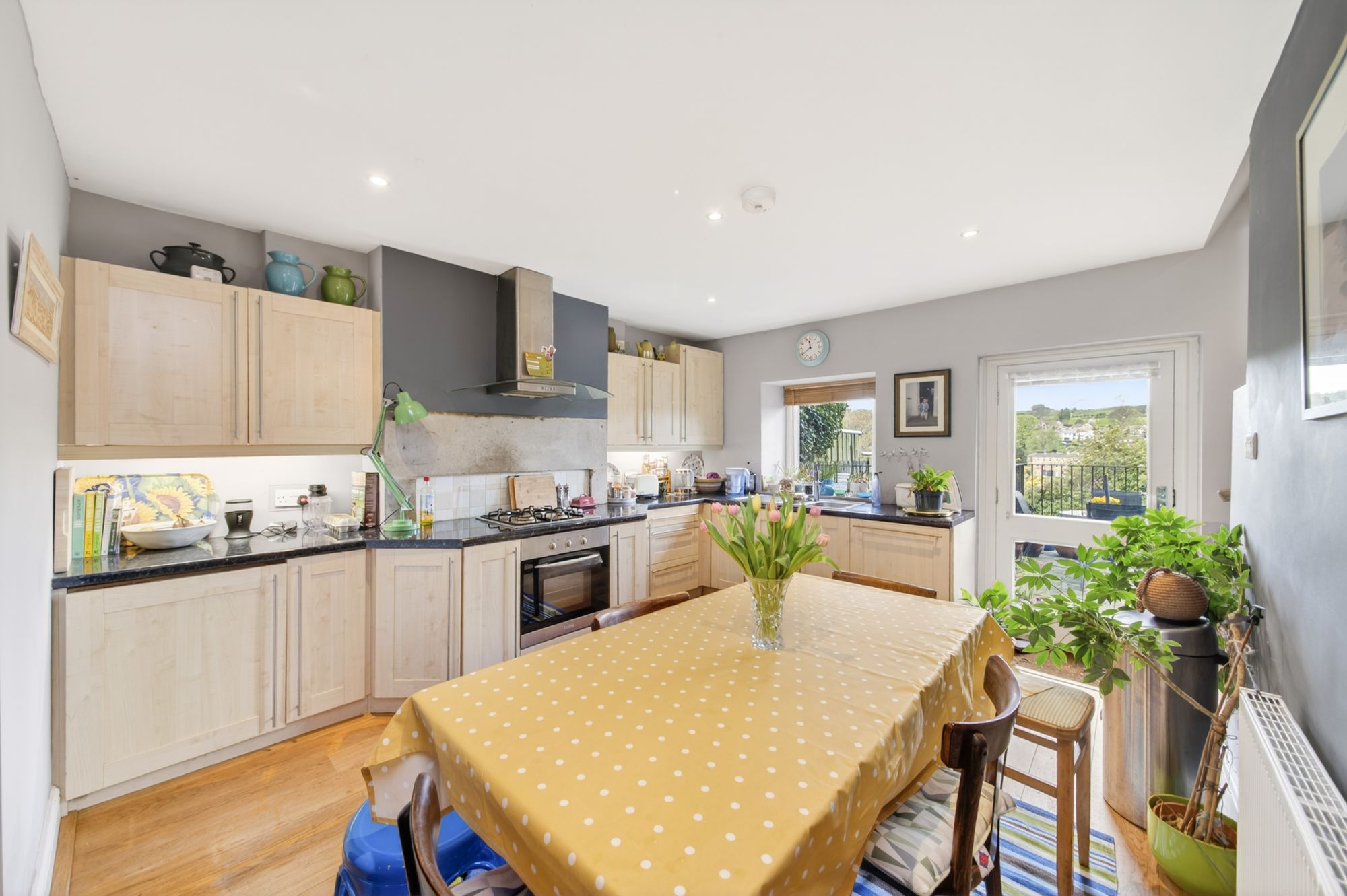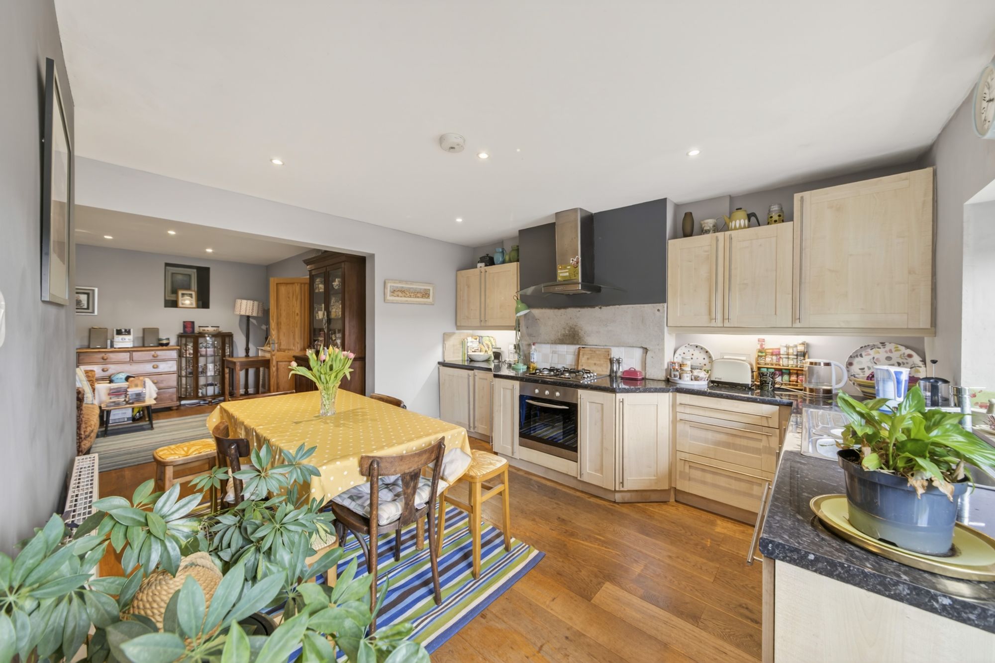 The kitchen features a range of fitted wall and base units with Shaker-style cupboard fronts and with complementary, rolled edge work surfaces over which incorporate a one-and-a-half-bowl sink with chrome mixer tap. The kitchen is equipped with built-in appliances which include a four-ring gas hob with canopy-style cooker hood over and built-in, fan assisted, electric oven. There is an integrated, undercounter fridge unit and a built-in dishwasher. The kitchen features a cupboard which houses the wall-mounted boiler, a double-glazed window and external glazed door to the rear elevation, giving access to the gardens and providing open-aspect views. There is hardwood flooring, inset spot lighting to the ceilings, a radiator and a useful understairs cupboard.