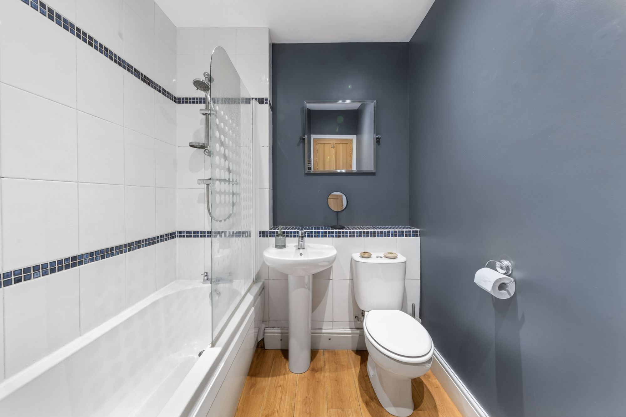 The house bathroom features a white, three-piece suite which comprises a panelled bath with thermostatic shower over with glazed shower guard, a pedestal wash handbasin with chrome, Monobloc mixer tap and a low-level WC with push-button flush. There is laminate flooring, tiling to the splash areas, inset spot lighting to the ceilings and an extractor fan. Additionally, there is a chrome, ladder-style radiator.
