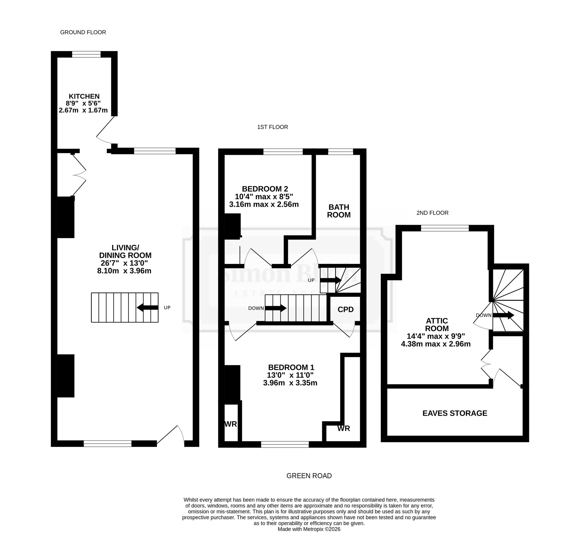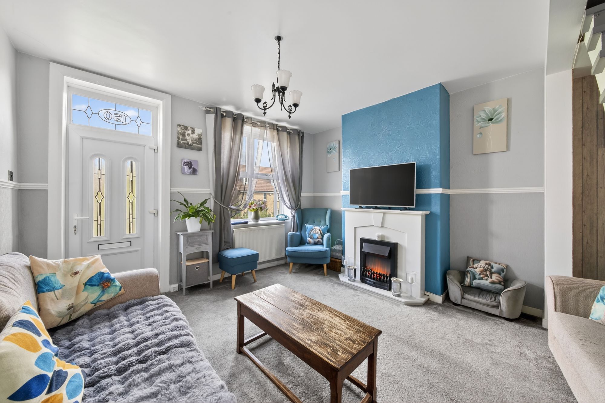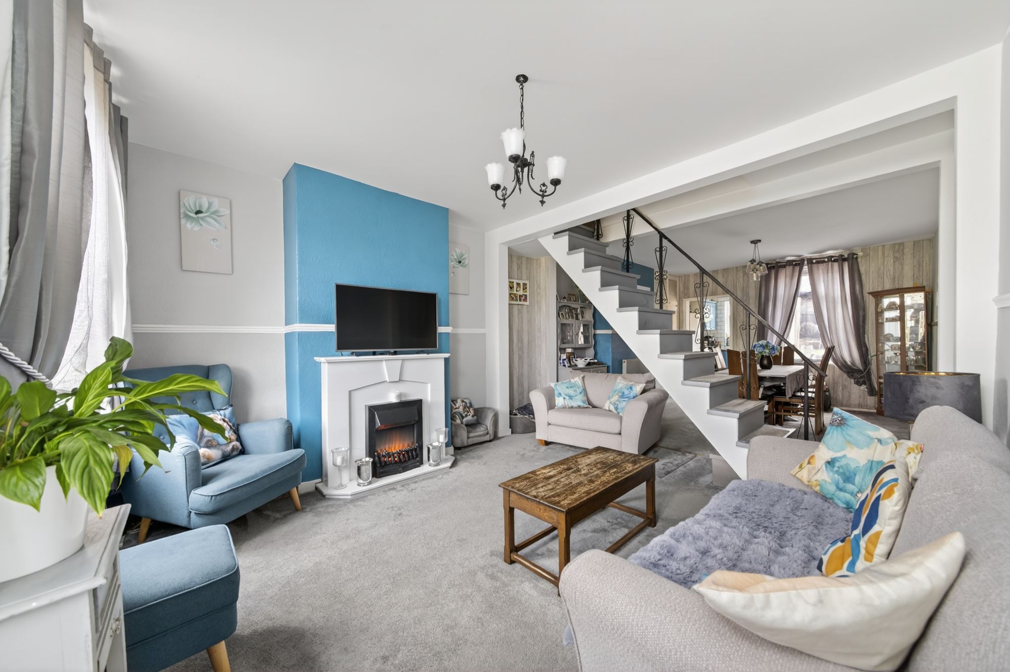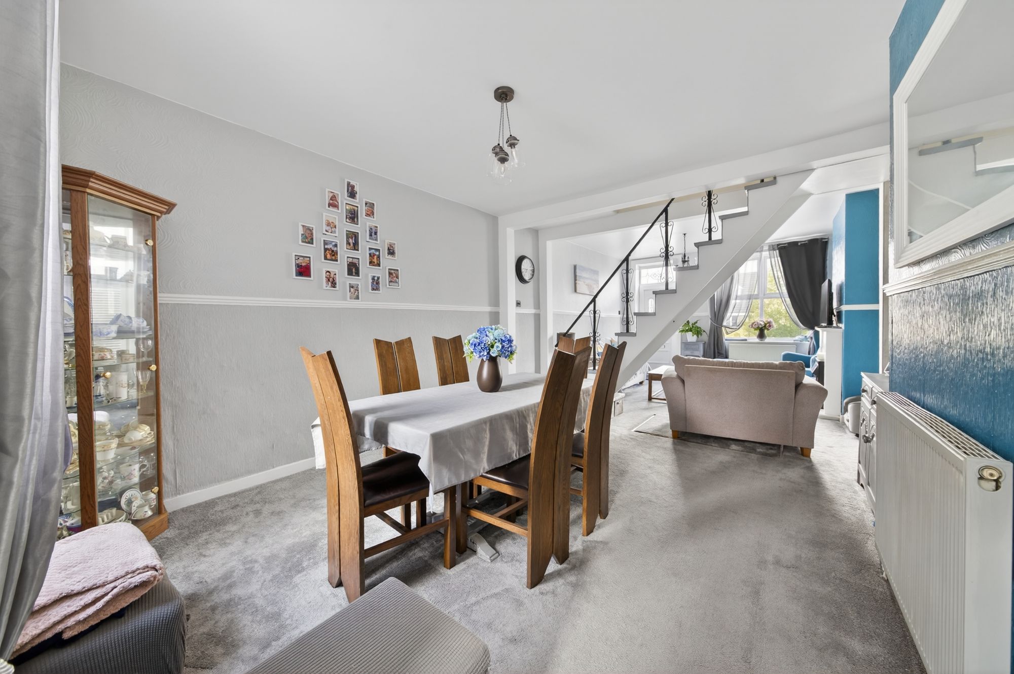 OPEN PLAN LIVING DINING ROOMA spacious open plan living and dining area, offering ample room for lounge furniture and a dining table and chairs. The room benefits from an abundance of natural light via uPVC double glazed windows to both the front and rear elevations. A staircase rises centrally within the room to the first floor landing. Further features include ceiling lights, two central heating radiators, and an electric fire set within a decorative surround forming the main focal point. There are built-in storage cupboards and access to a floor hatch providing entry to the property’s cellar. From here, access is gained to the kitchen.