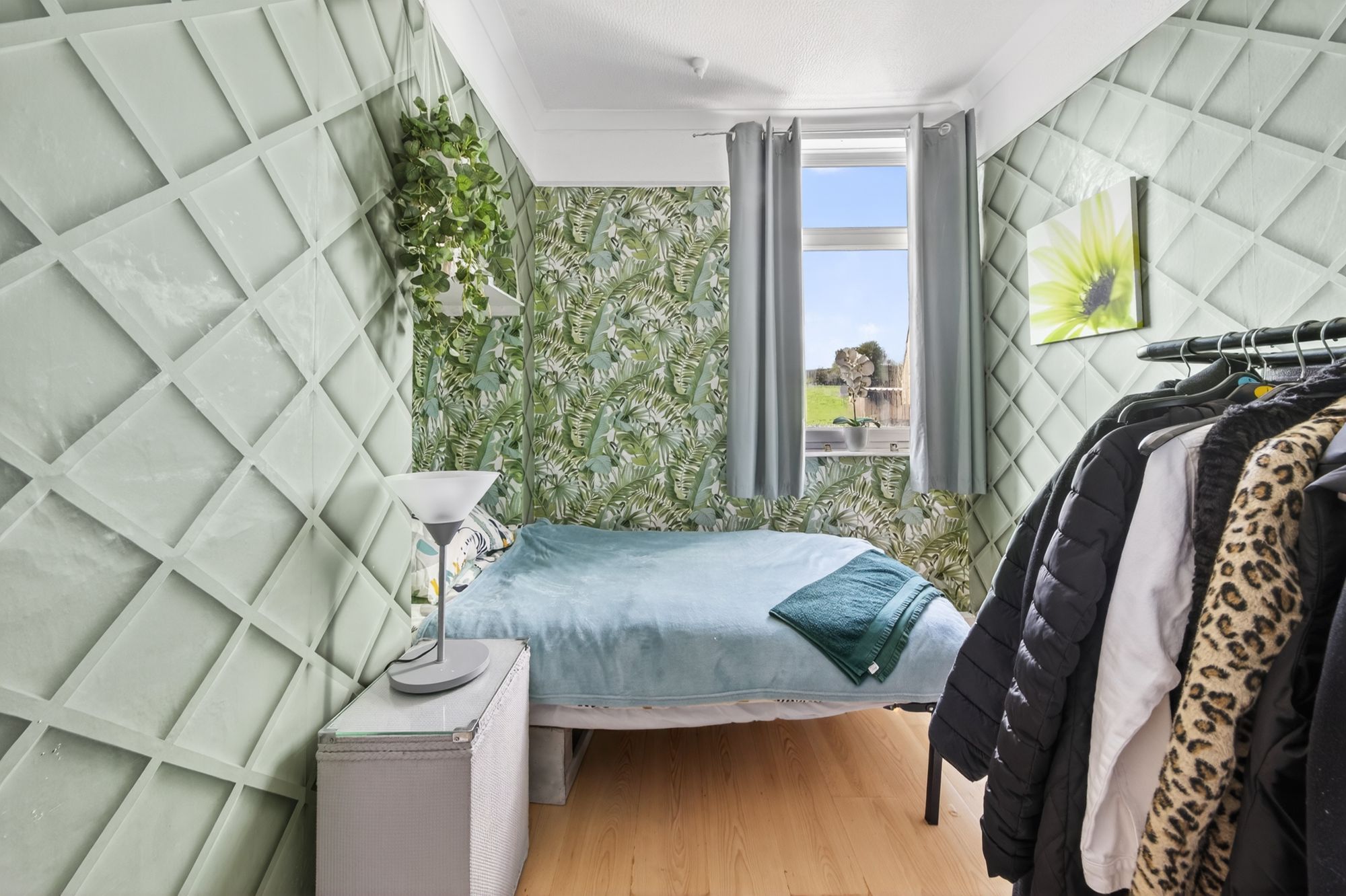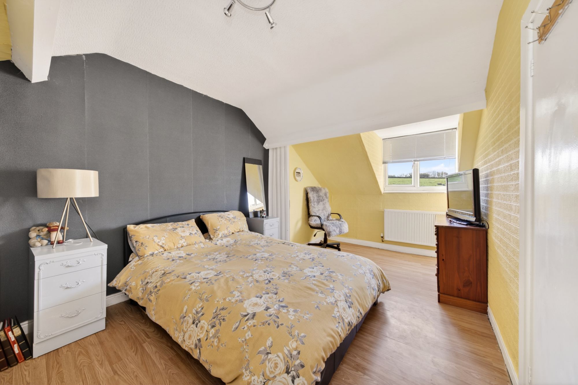 BEDROOM TWOA double bedroom featuring a ceiling light, central heating radiator, and wood-effect laminate flooring, with a uPVC double glazed window to the rear elevation enjoying views towards open fields.
