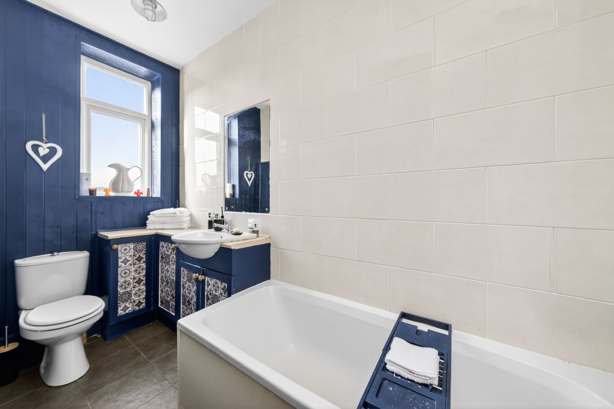 HOUSE BATHROOMComprising a three piece suite in the form of close coupled W.C., hand wash basin sitting within a vanity unit with chrome taps over and bath with chrome taps. There is ceiling light, part tiling to walls, heated towel rail/ central heating radiator and uPVC double glazed window to the rear.