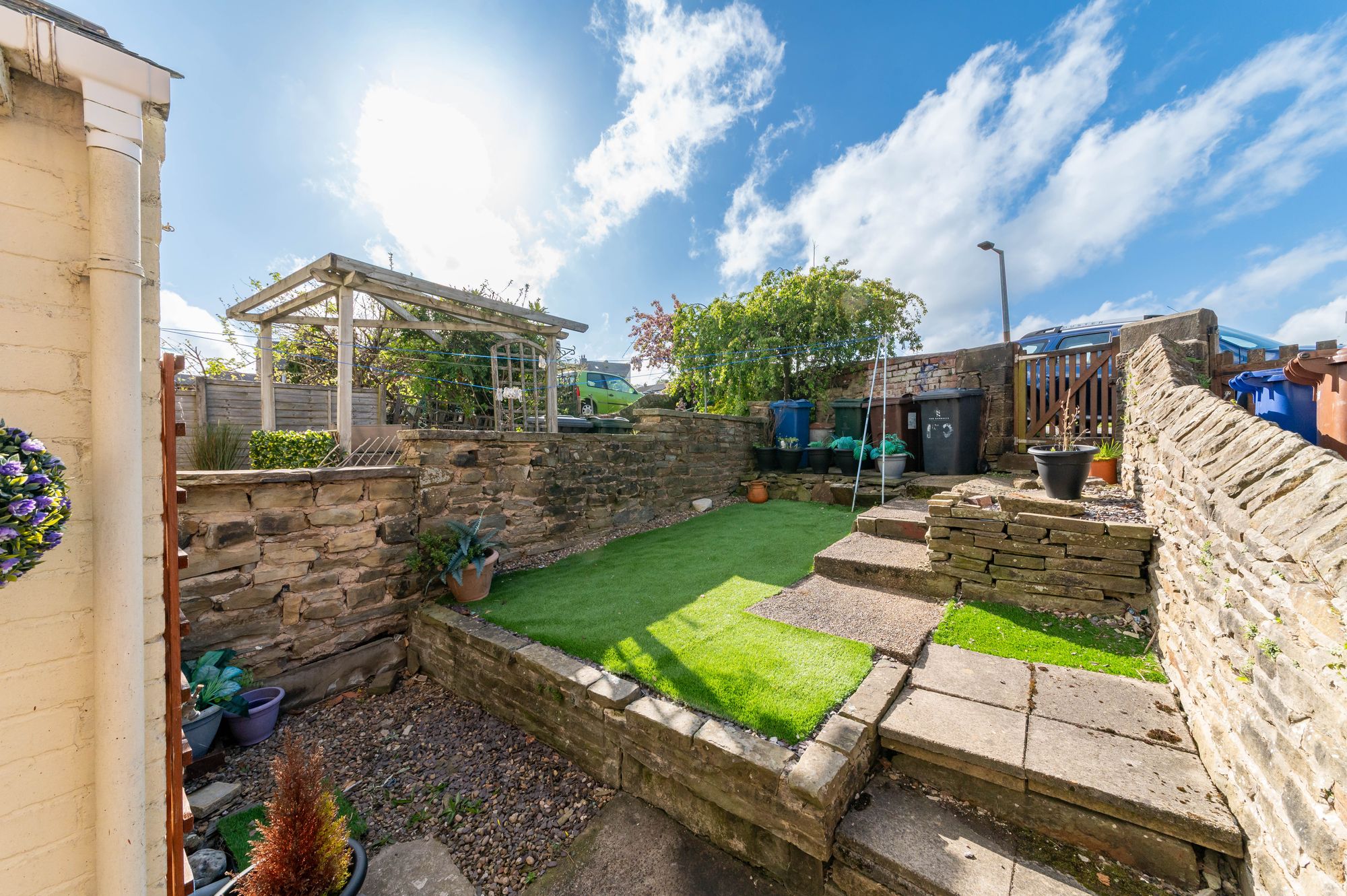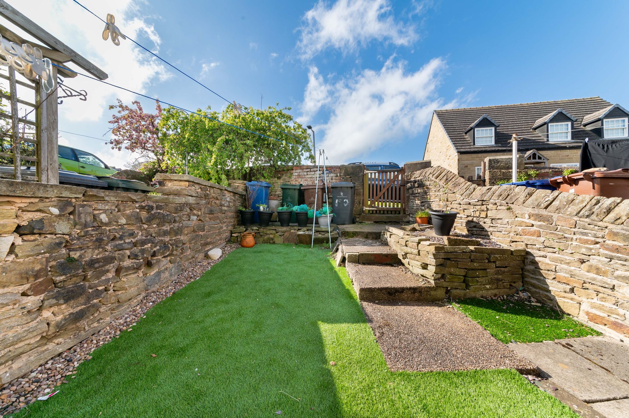 OUTSIDETo the front of the home, steps rise to a garden area laid with artificial lawn, enclosed by a dry stone wall. To the rear, there is a fully enclosed garden featuring an artificial lawn, a concrete pathway leading to timber gate giving access out.