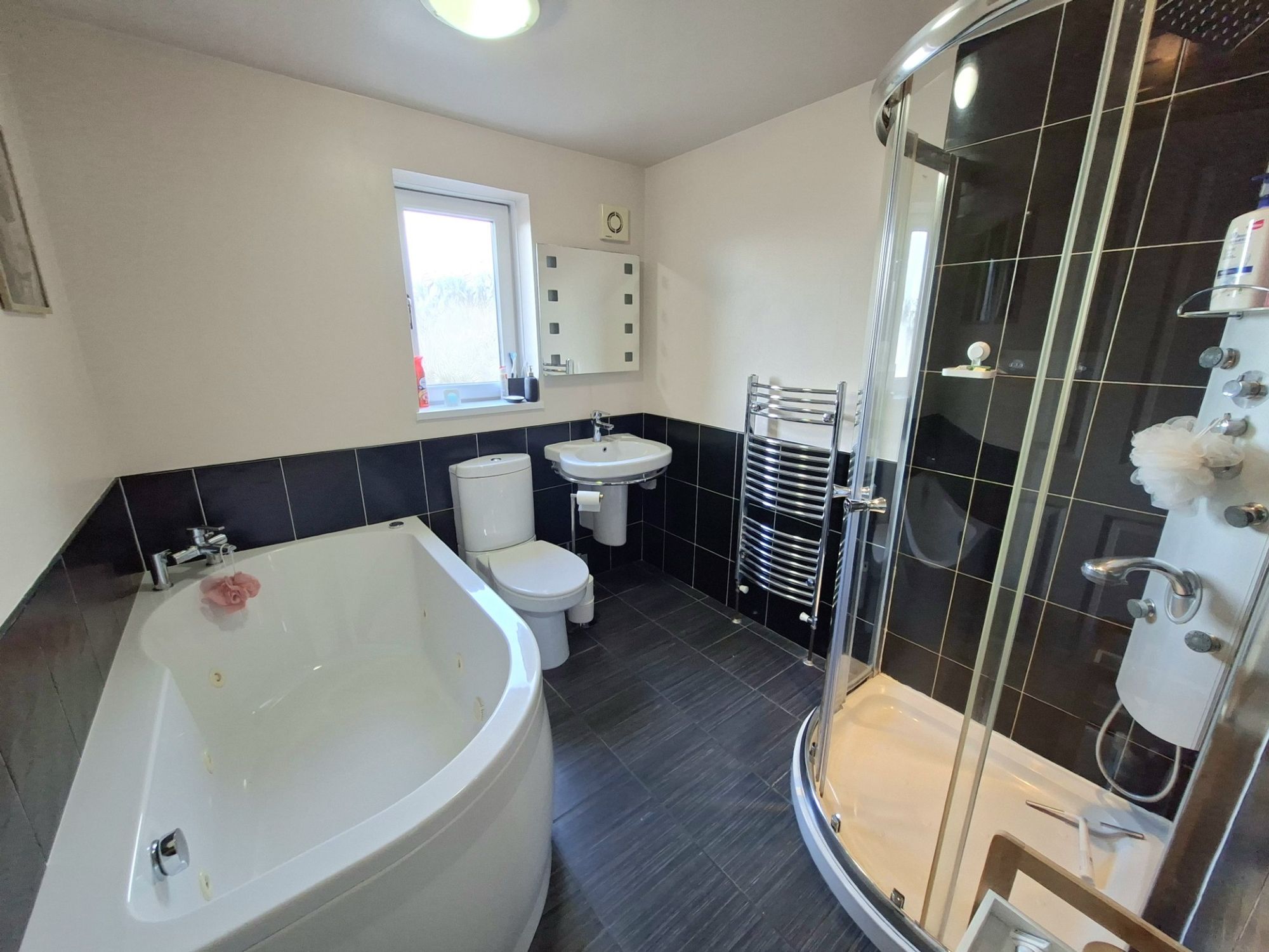FAMILY BATHROOMThe family bathroom is a great size, so much so that it has a both a separate large bath and separate corner shower. The space is modern and very well appointed with high quality bathroom fixtures and fittings - including a heated towel rail.