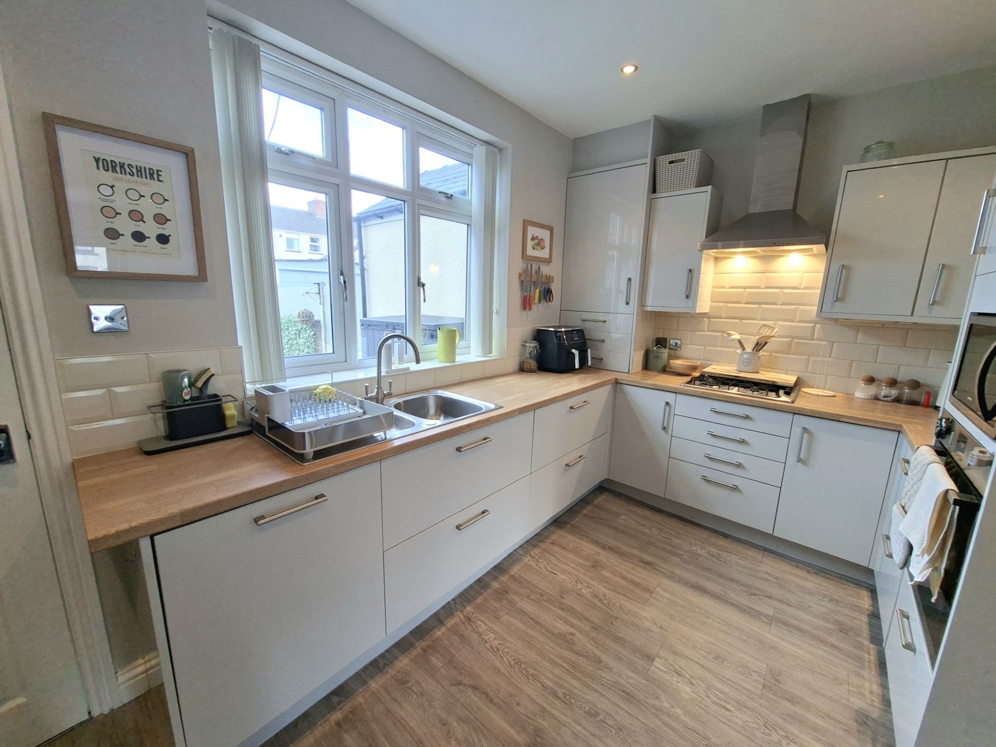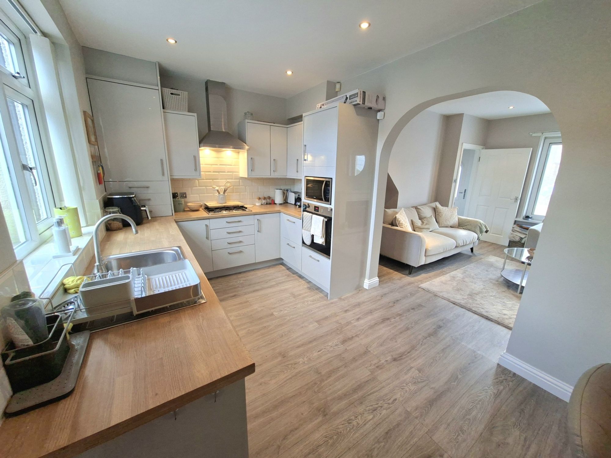 KITCHENThe family kitchen is modern and stylish and flows through from the living room. The space is has ample cupboard and worktop space along with integrated cooker, microwave, gas hob, extractor and dishwasher. Ideal for modern family living.