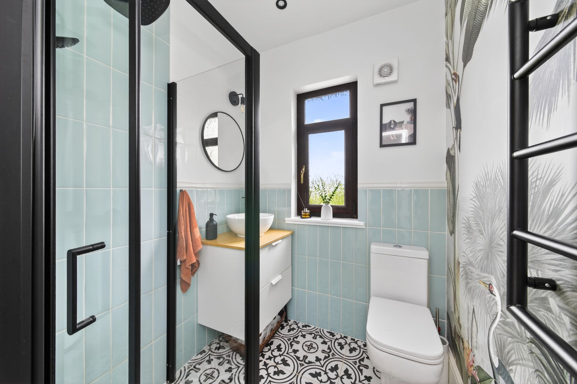 The shower room features a modern, contemporary three-piece suite, comprising a low-level WC with push-button flush, a circular bowl wash hand basin set on a vanity shelf with drawers beneath, and a wet-room-style shower with a thermostatic rainfall shower head and a separate handheld attachment. The room has attractive tiled flooring, with contrasting high-gloss tiling to the walls and a ceramic dado rail. There is a shaver light point, inset ceiling spotlights, and an extractor fan. Additionally, a double-glazed window with obscure glass to the rear elevation provides natural light, and there is a wall-mounted ladder-style radiator.