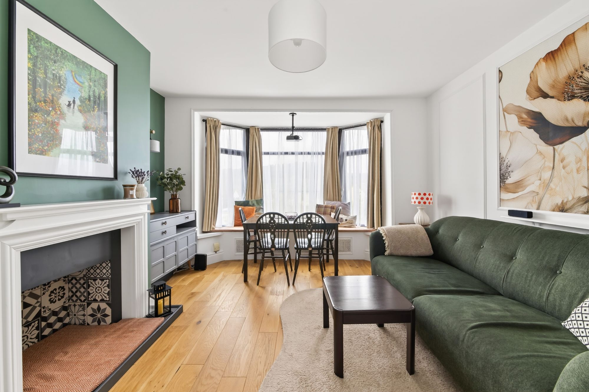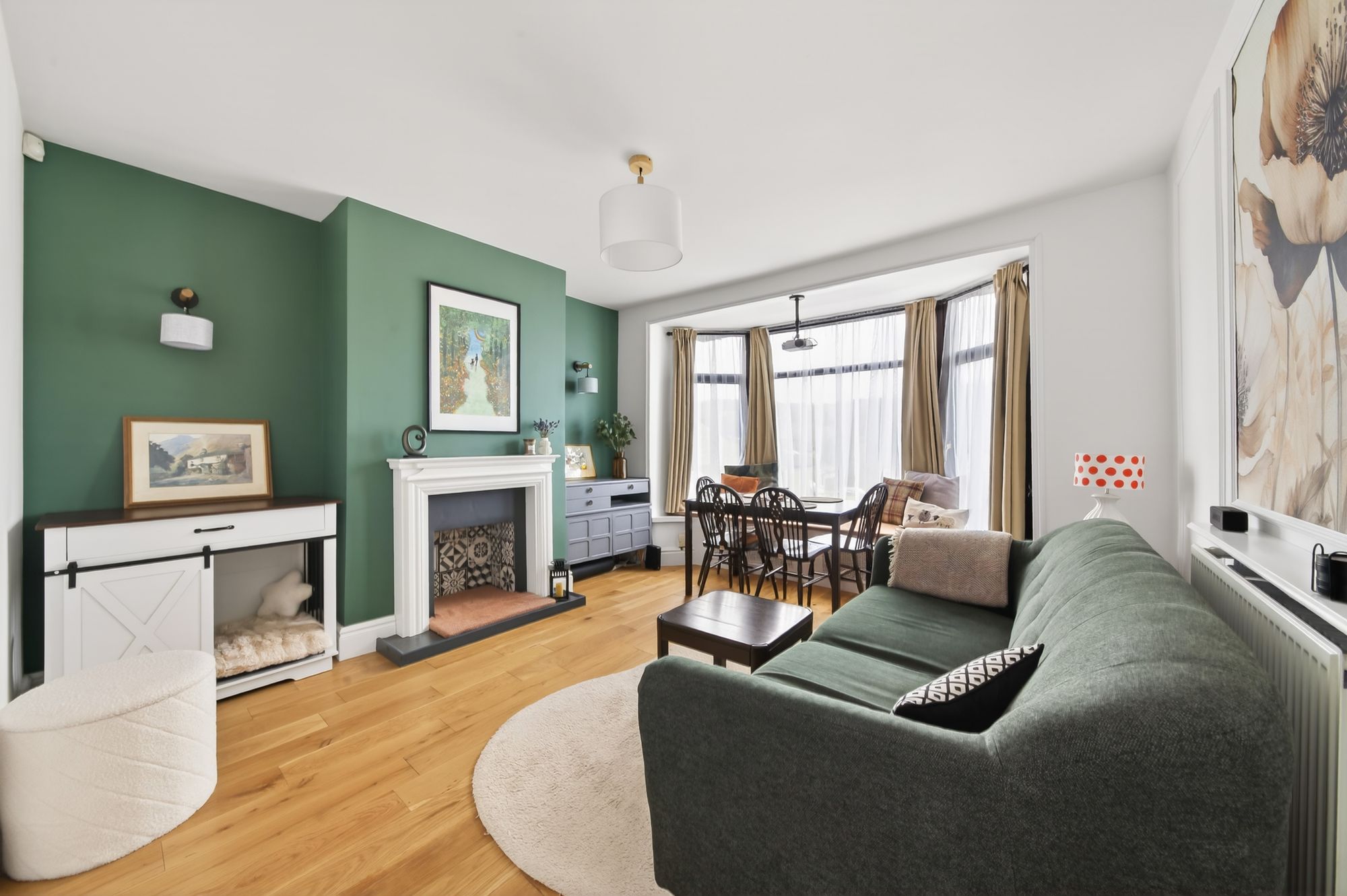 The open-plan living dining room is a generously proportioned, light and airy reception room, which features a fabulous bay window to the front elevation, with a window seat beneath, giving superb open-aspect views over rooftops across the valley. The room is decorated to a high standard and features a central ceiling light point, two wall light points, beautiful oak flooring, and a radiator. There is also decorative wall panelling. The focal point of the room is a decorative inset fireplace set into the chimney breast, with an attractive tiled inset, raised hearth, and ornate mantel surround.