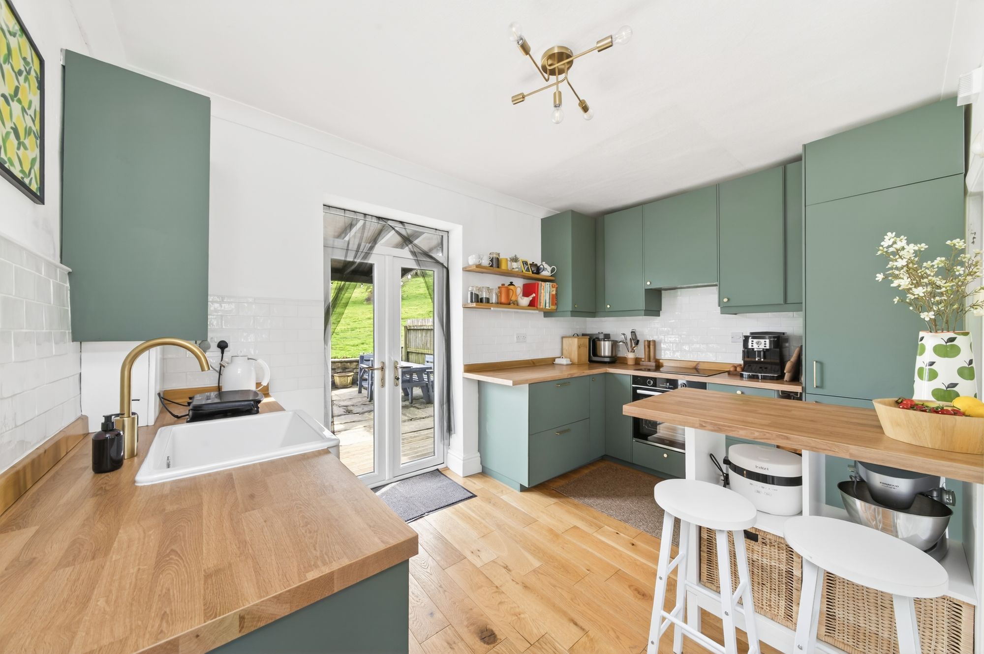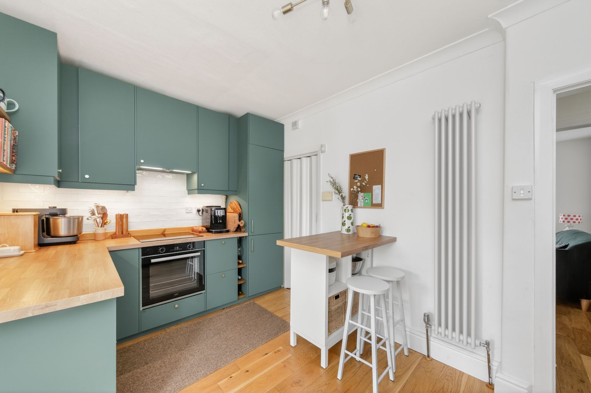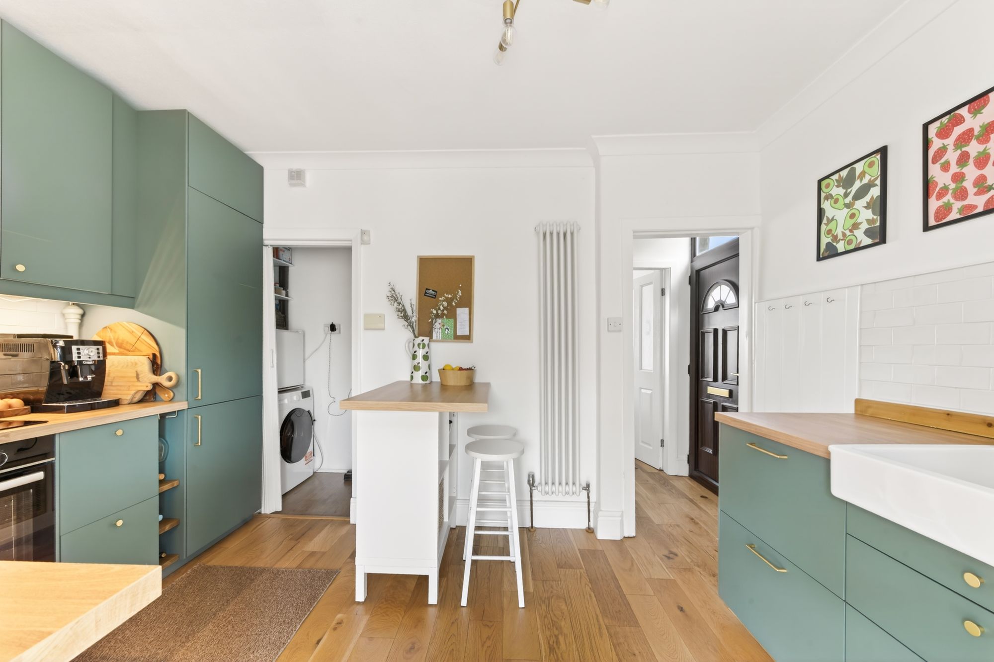 There is decorative coving to the ceilings, a ceiling light point, a vertical column radiator, and a breakfast bar with shelving under, ideal for informal dining and food preparation. A cupboard also houses the wall-mounted combination boiler, and doorway then leads to the understairs utility room.