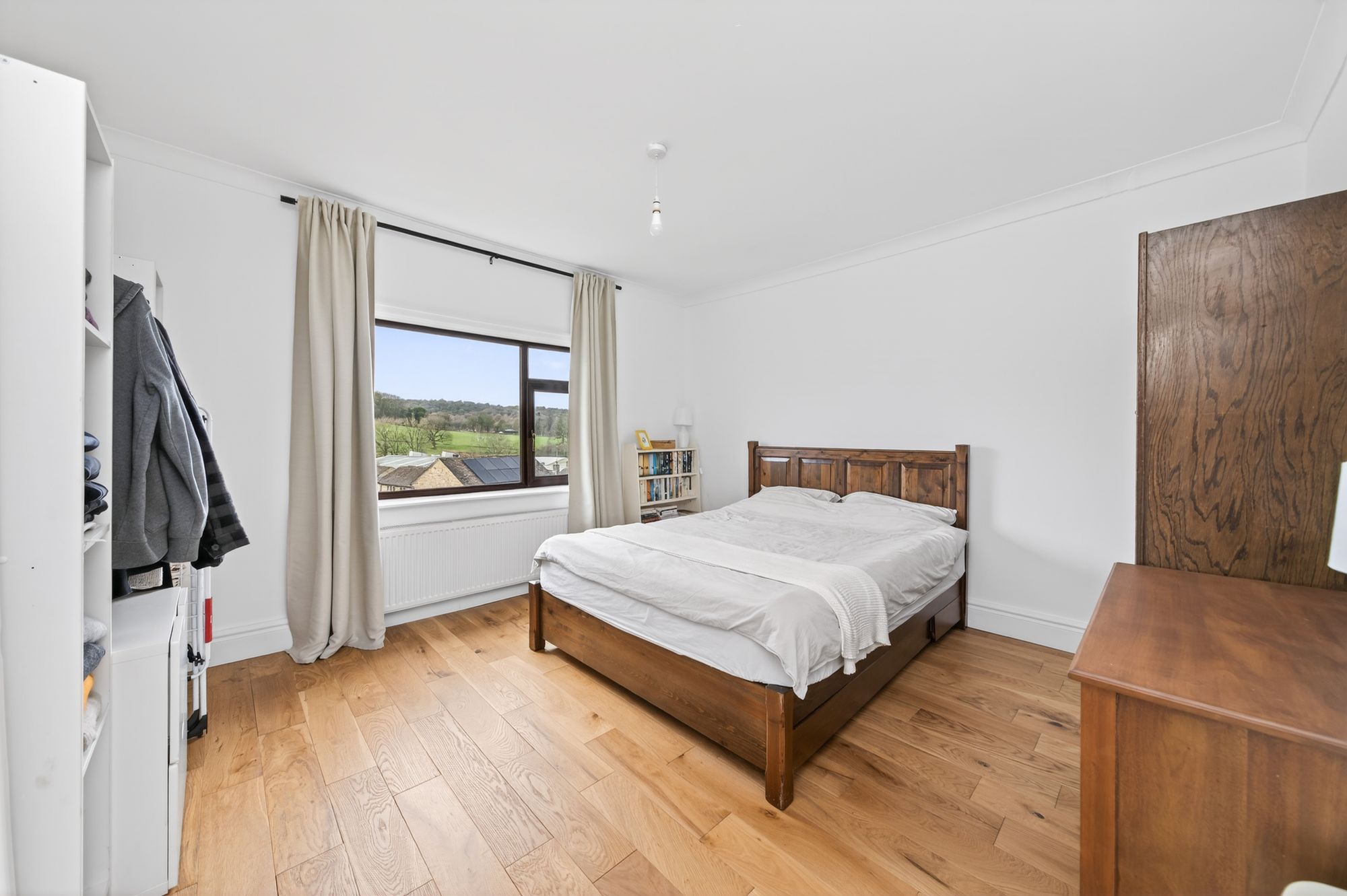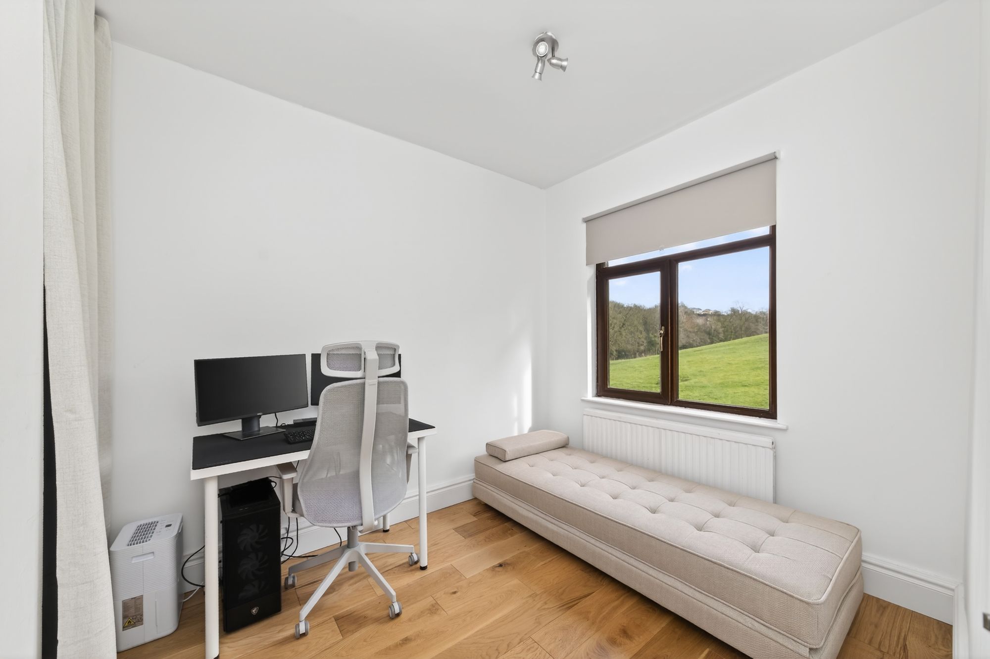 Bedroom two enjoys a great deal of natural light, which cascades through the bank of double-glazed windows to the rear elevation, and again has fantastic open-aspect views. The room can accommodate a double bed, with space for freestanding furniture, and is currently utilised as a home office. It features a ceiling light point, a radiator, and a useful alcove with a fitted rail and shelving over the bulkhead for the stairs.