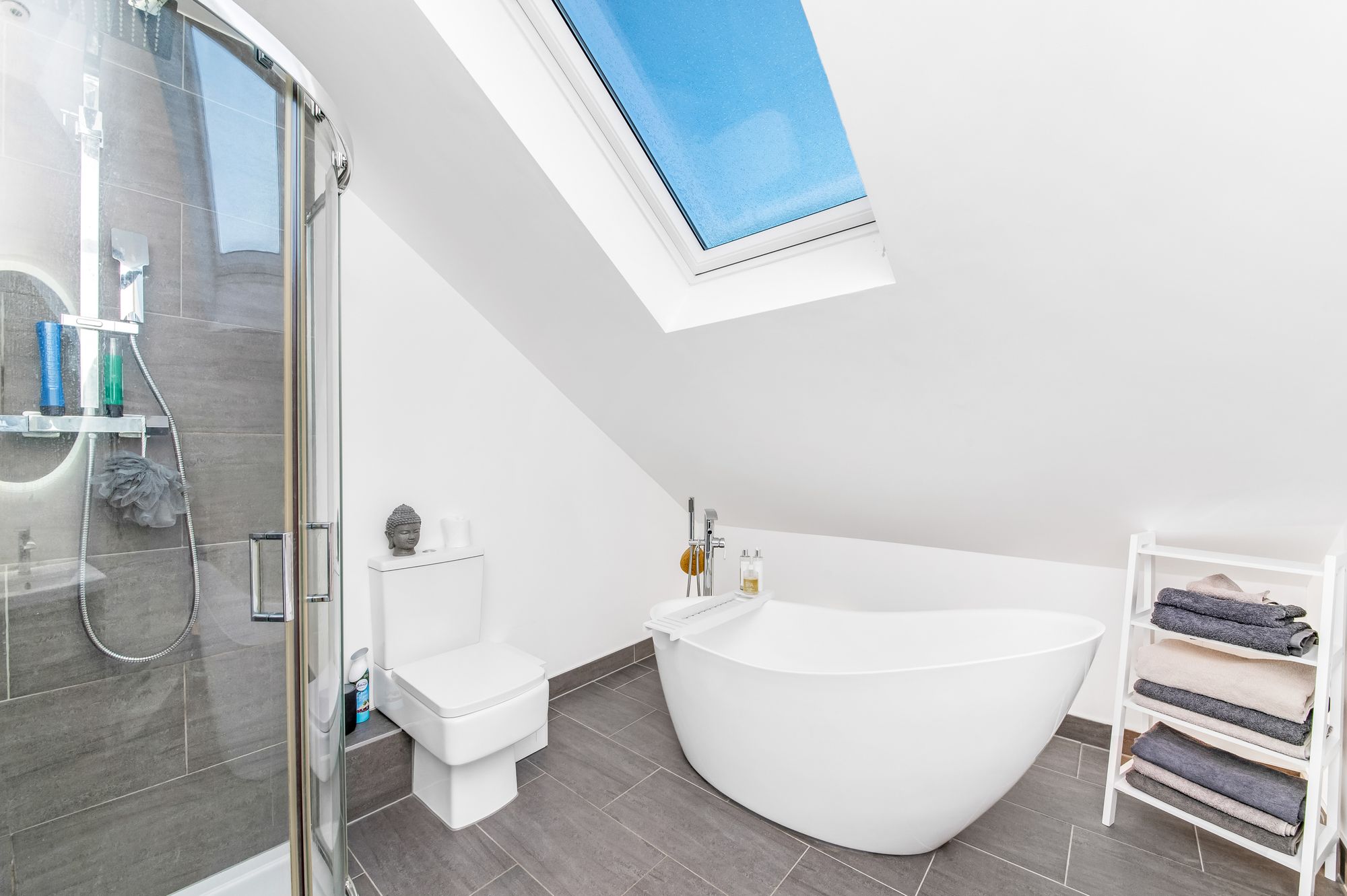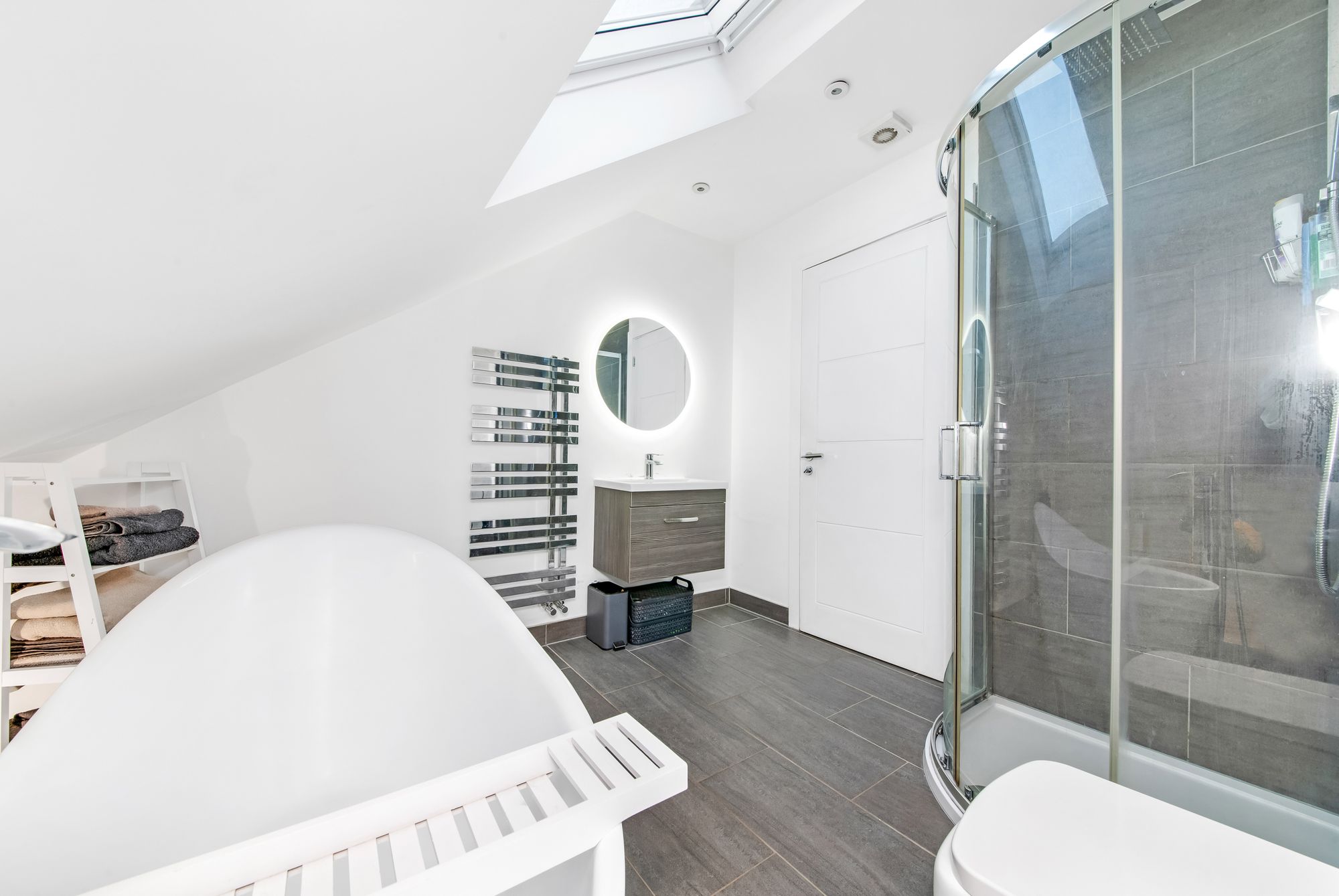 The en-suite bathroom features a modern, high-quality, four-piece suite comprising a freestanding egg-shaped bath with floor-mounted chrome mixer tap with showerhead attachment, a low-level WC with push-button flush, a quadrant-style shower cubicle with thermostatic rainfall showerhead and separate handheld attachment, and a broad wall-hung wash hand basin with vanity cupboard beneath and chrome mixer tap. There is attractive tiled flooring and matching tiled skirting, tiling to the splash areas, inset spotlighting to the ceiling, an extractor fan, a double-glazed skylight window, a chrome ladder-style radiator, an LED backlit vanity mirror, and an additional light point under the eaves providing ambient lighting.