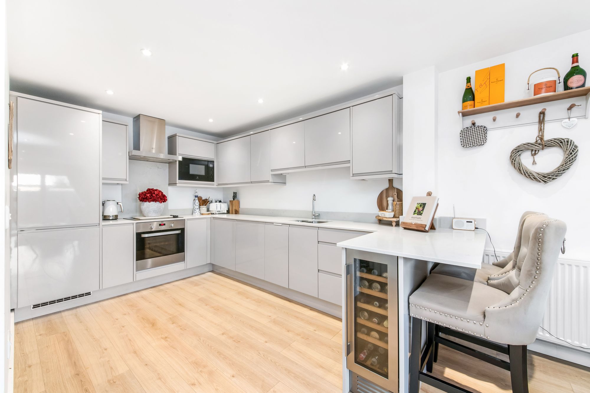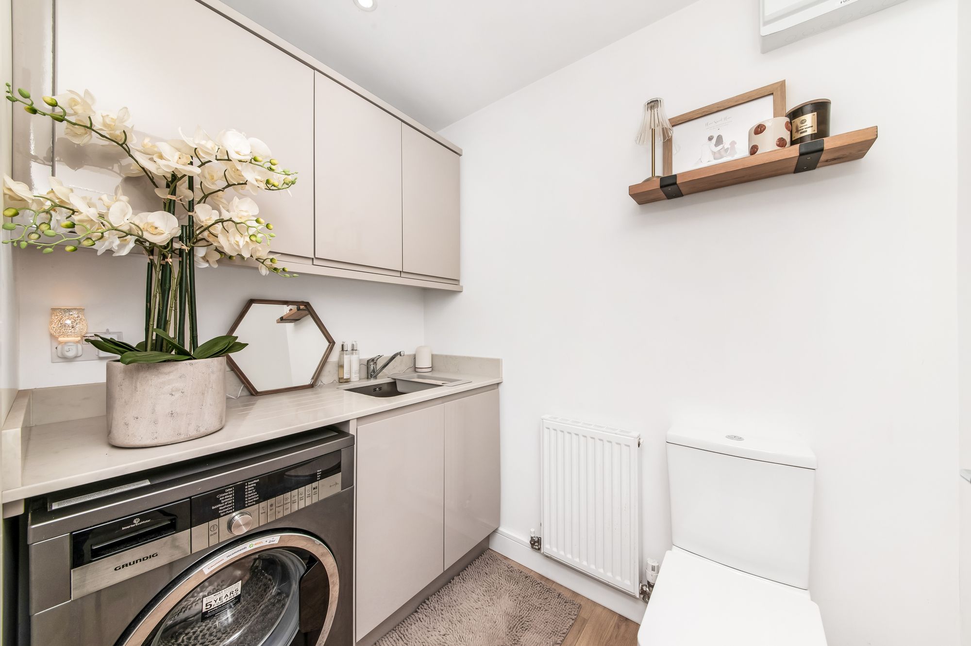 This multi-purpose and flexible space features high-quality fitted furniture including fitted wall and base units with high-gloss, handleless cupboard fronts and quartz work surfaces over, which incorporate a bevelled drainer and inset stainless-steel sink unit with chrome mixer tap over. The utility benefits from a matching upstand to the work surface, plumbing and provisions for an automatic washing machine, and soft-closing doors and drawers. There is also a low-level WC with push-button flush, a radiator, an extractor fan, and recessed spotlighting to the ceiling.