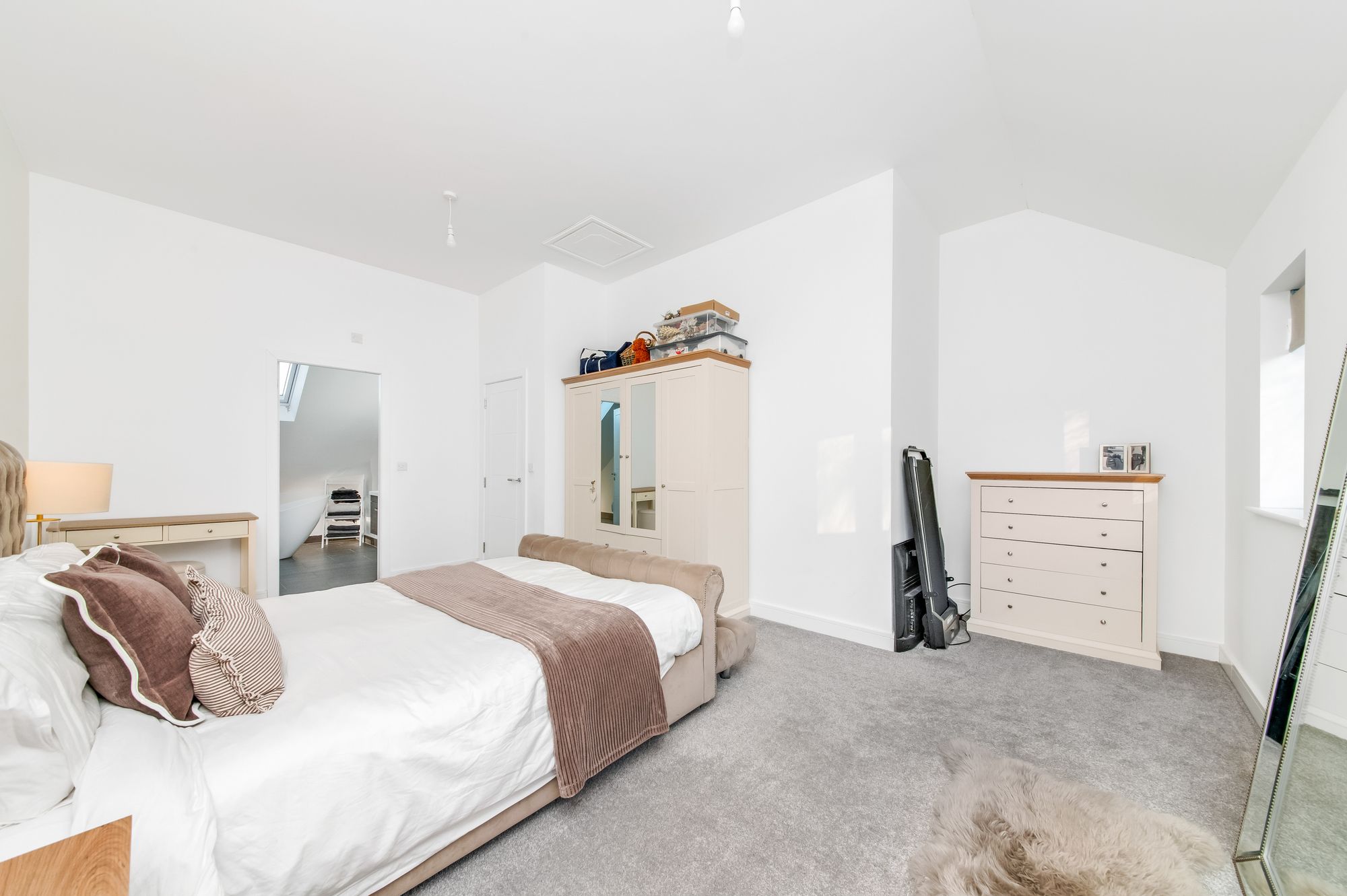 The principal bedroom is a generously proportioned, light and airy double bedroom with ample space for freestanding furniture. There is a bank of double-glazed windows and an additional single window to the front elevation, providing a great deal of natural light and a pleasant tree-lined outlook, as well as a part-vaulted ceiling, two ceiling light points, a radiator, and a loft hatch providing access to an attic space. Bedroom one has space for either fitted furniture or a study area, and a door leading into the en-suite bathroom facilities.