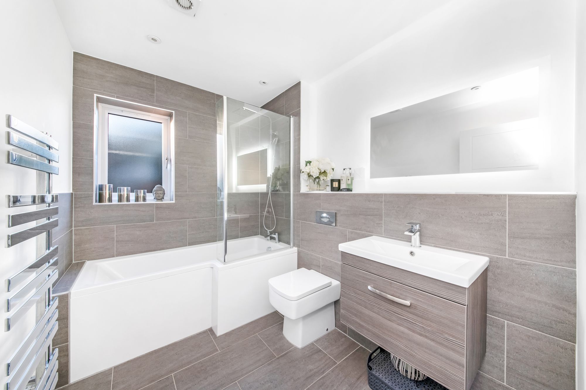 The house bathroom features a modern, three-piece suite comprising an L-shaped panel bath with thermostatic rainfall shower over, separate handheld attachment and glazed shower guard, a low-level WC with concealed cistern and push-button flush, and a broad wall-hung wash hand basin with vanity drawer beneath and chrome mixer tap. There is attractive tiled flooring and tiling to the walls and splash areas, a double-glazed window with obscure glass to the side elevation, a chrome ladder-style radiator, an extractor fan, inset spotlighting, and a back-lit LED vanity mirror.