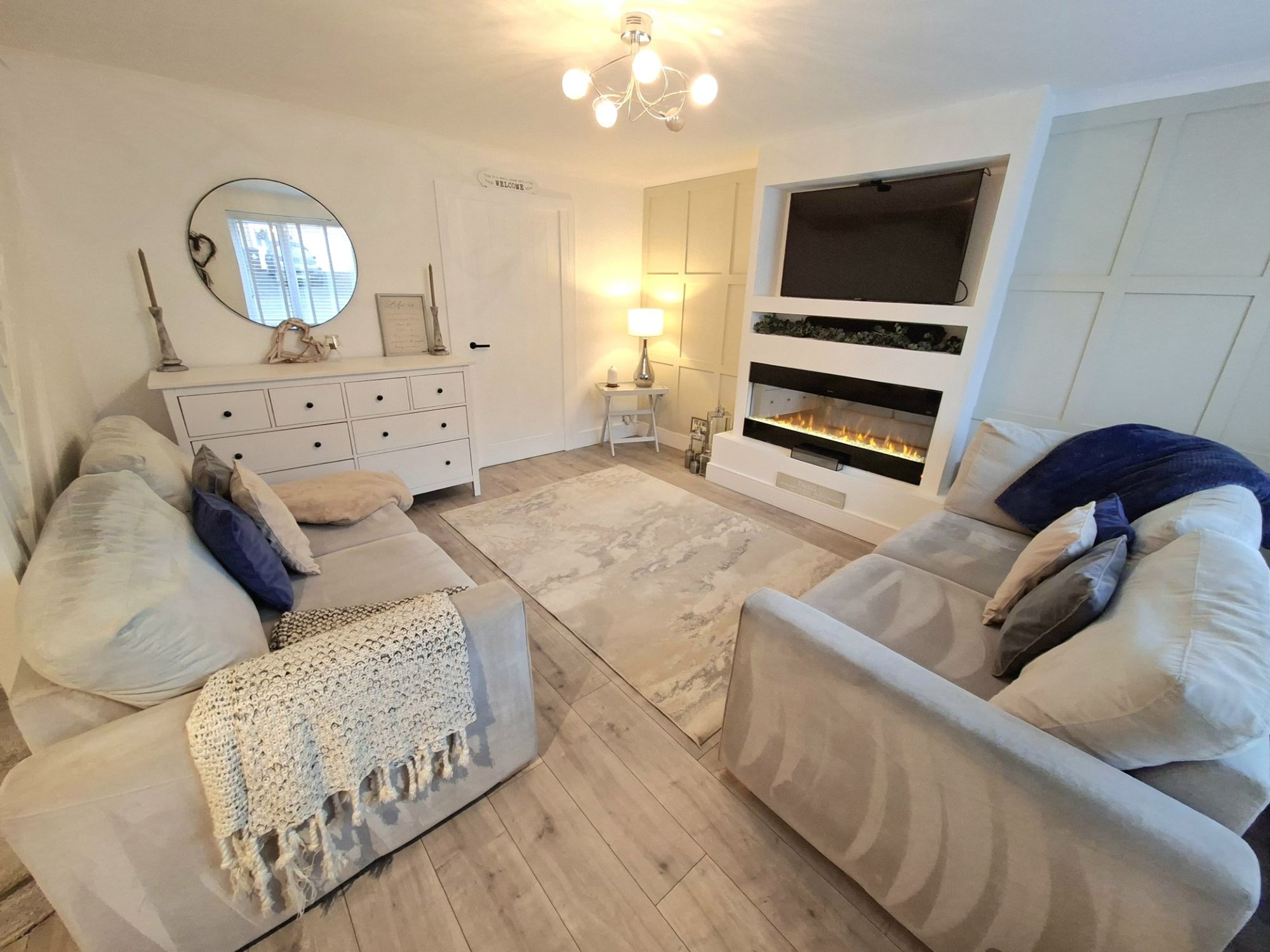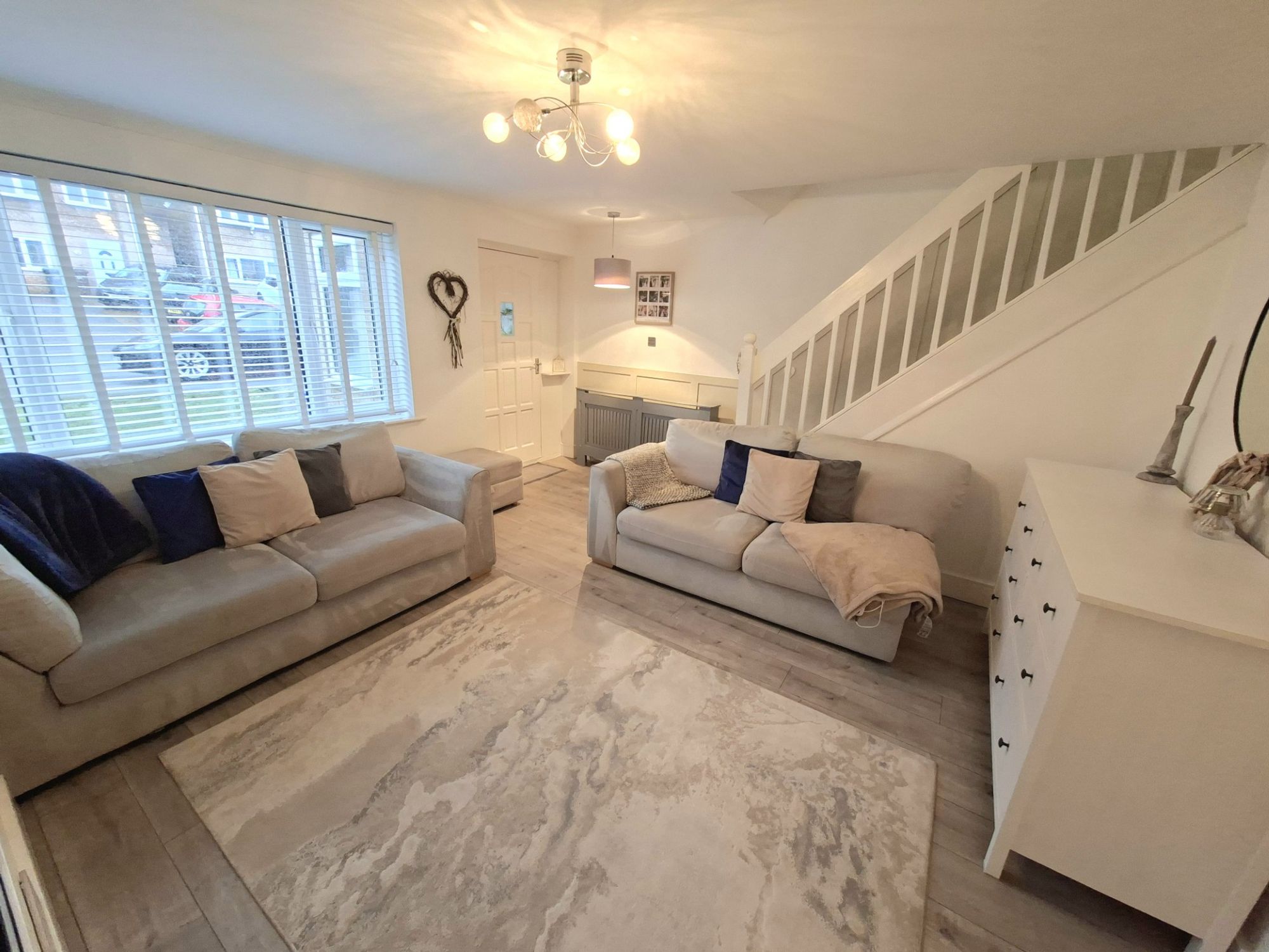 This is a spacious and bright living room with a large window, wood effect laminate flooring and gas central heating.
