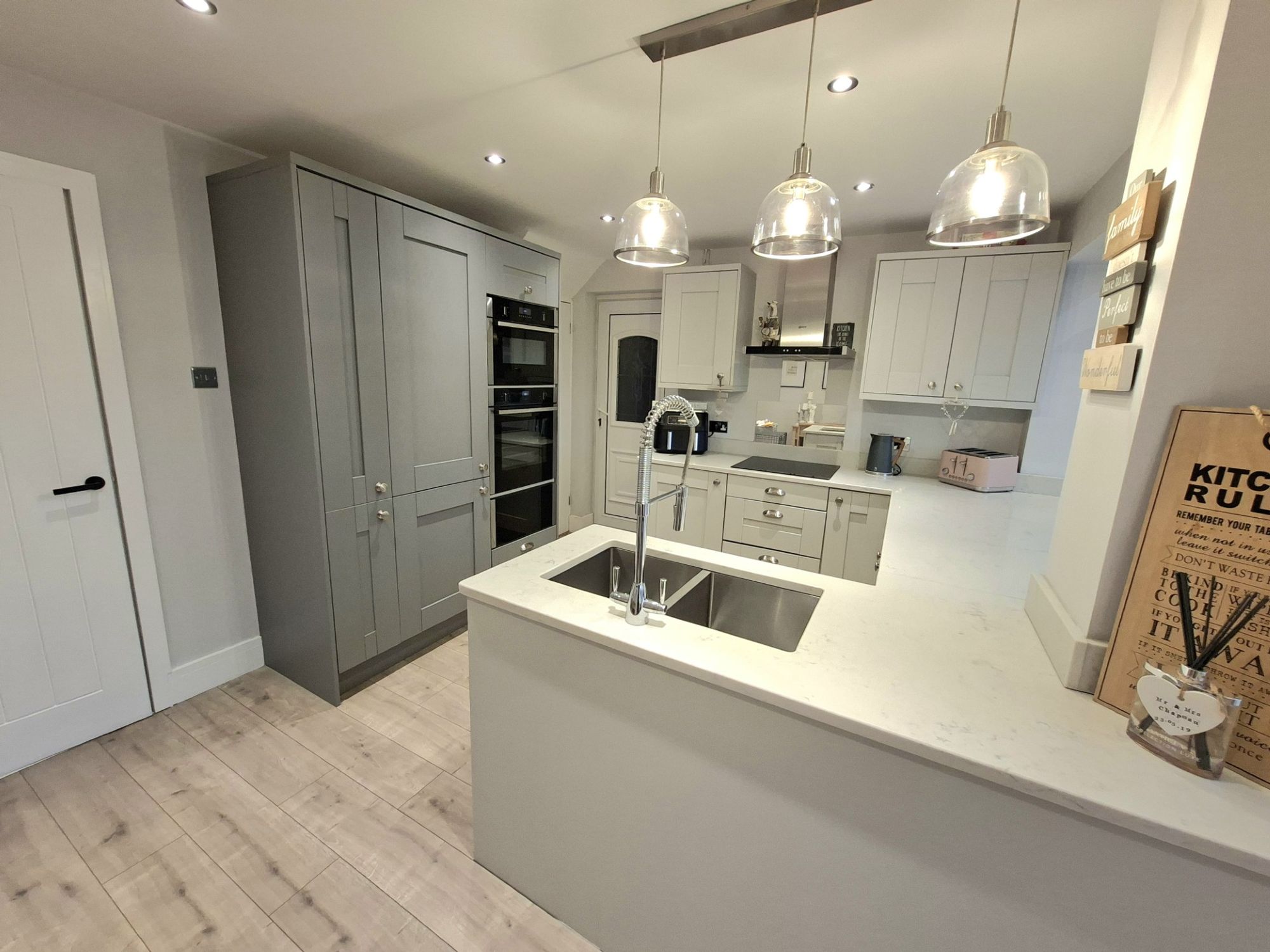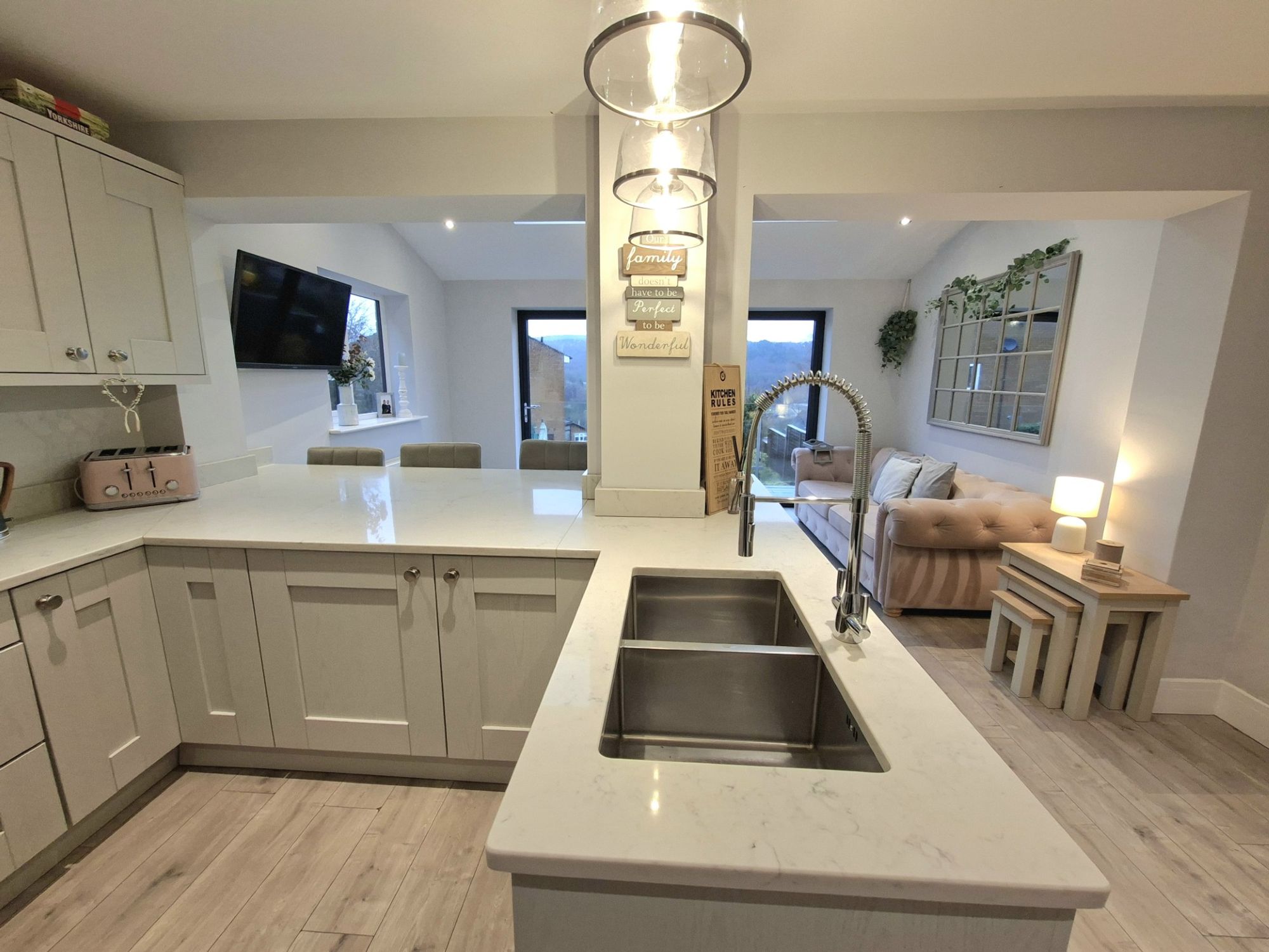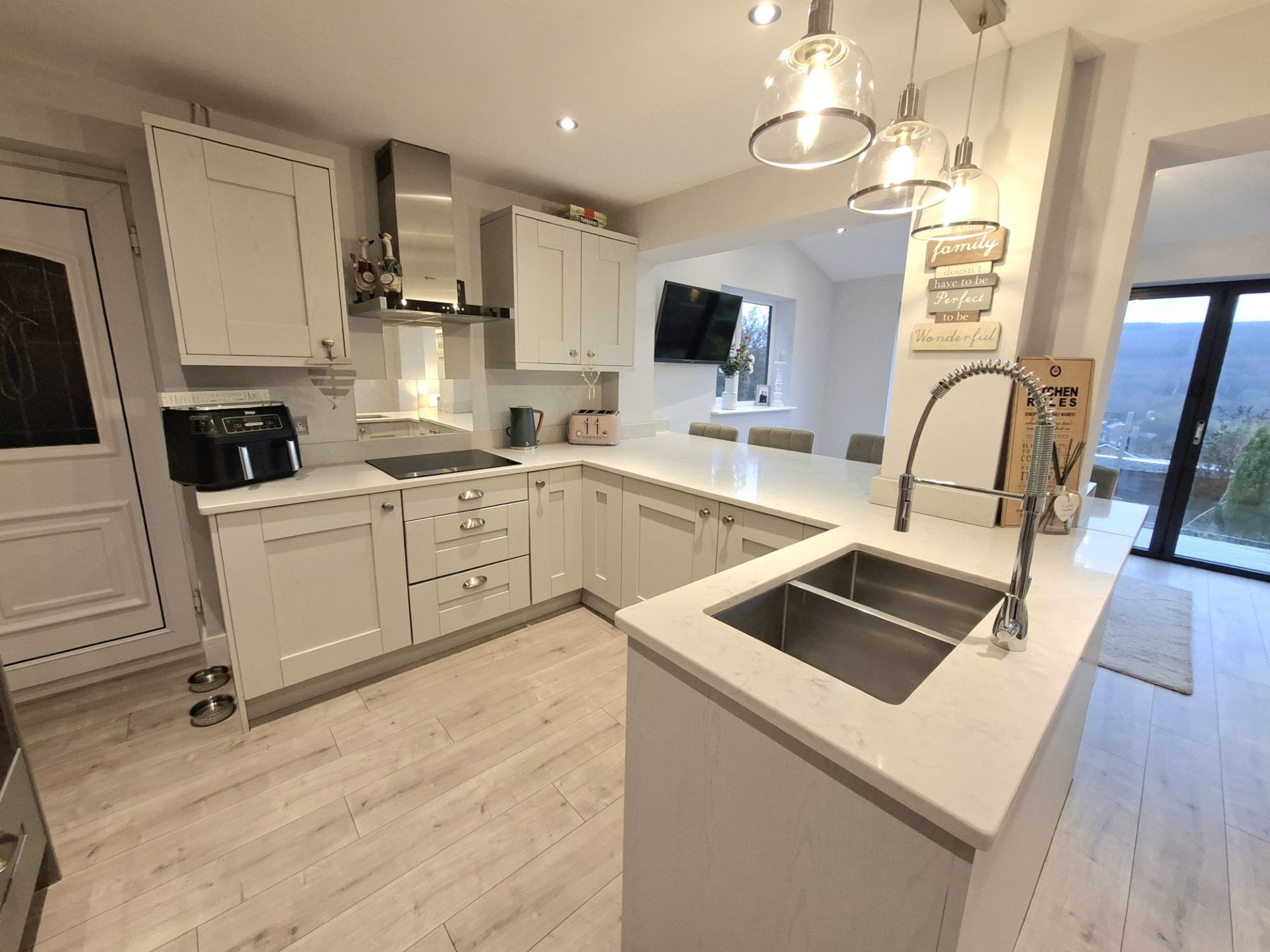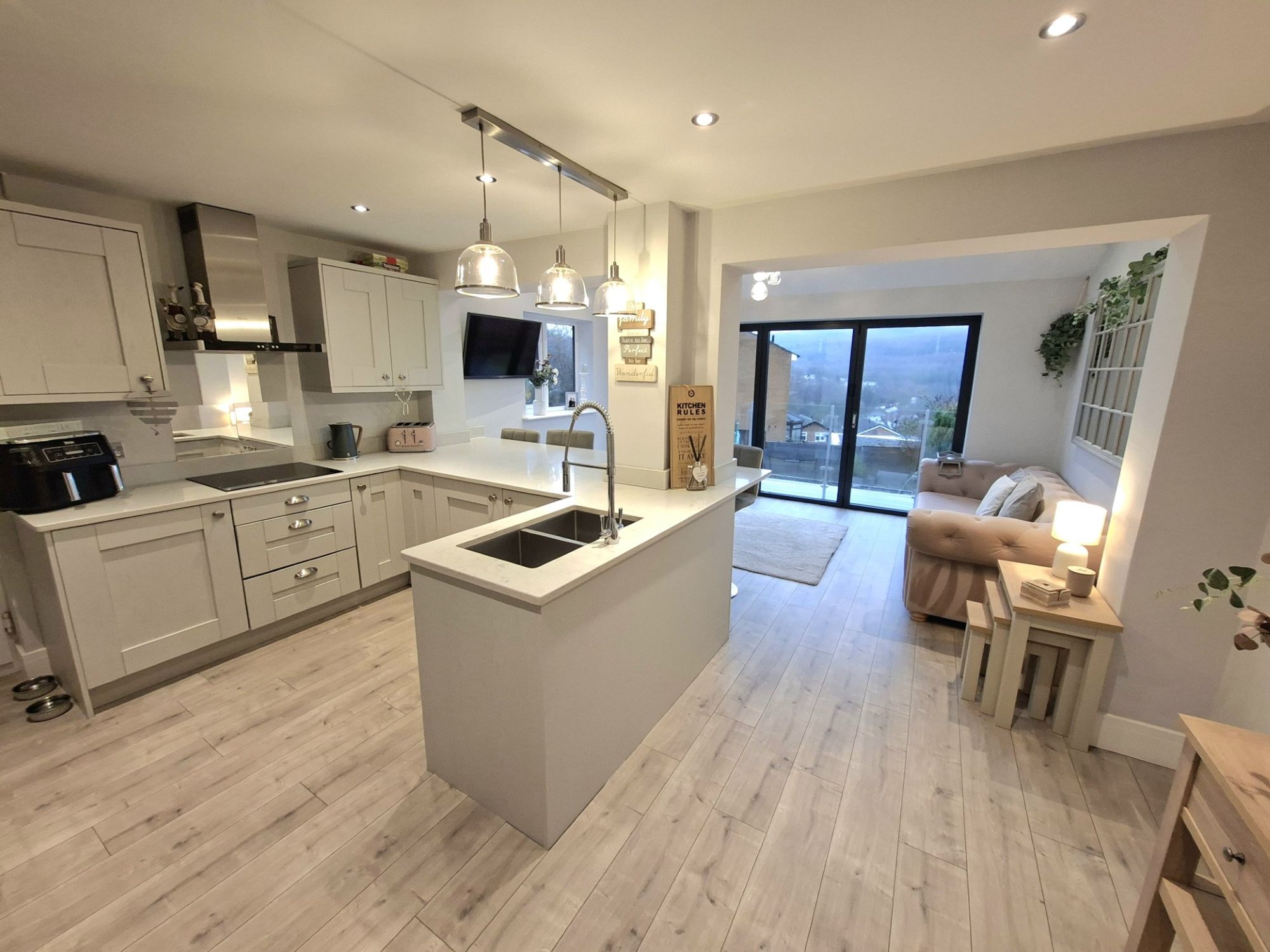 THIS IS AN INCREDIBLY WELL PRESENTED THREE BEDROOM SEMI-DETACHED FAMILY HOME THAT HAS BEEN FINISHED TO A VERY HIGH STANDARD THROUGHOUT. THE LARGE LIVING ROOM THE FRONT OF THE GROUND FLOOR IS IDEAL FOR QUIET EVENINGS IN FRONT OF THE TV. THE LARGE OPEN PLAN KITCHEN/FAMILY ROOM IS THE HEART OF THE HOME AND SIMPLY PERFECT FOR DAILY FAMILY LIFE AS WELL AS ENTERTAINING FAMILY AND FRIENDS. THE GREAT ACCOMMODATION CONTINUES UPSTAIRS WITH TWO GOOD DOUBLE BEDROOMS AND A FURTHER SINGLE BEDROOM. THE FAMILY BATHROOM IS VERY WELL FINISHED WITH FLOOR TO CEILING TILED WALLS AND MODERN THREE-PIECE SUITE. THE REAR GARDEN IS GREAT SPACE AND VERY CHILD/PET FRIENDLY AND THERE IS REAR TERRACE WITH GLASS BALUSTRADE FOR TAKING IN THE VIEWS TO THE REAR. THERE IS AN ATTACHED GARAGE WITH ACCESS FROM THE KITCHEN AS WELL OFF-STREET DRIVEWAY PARKING.