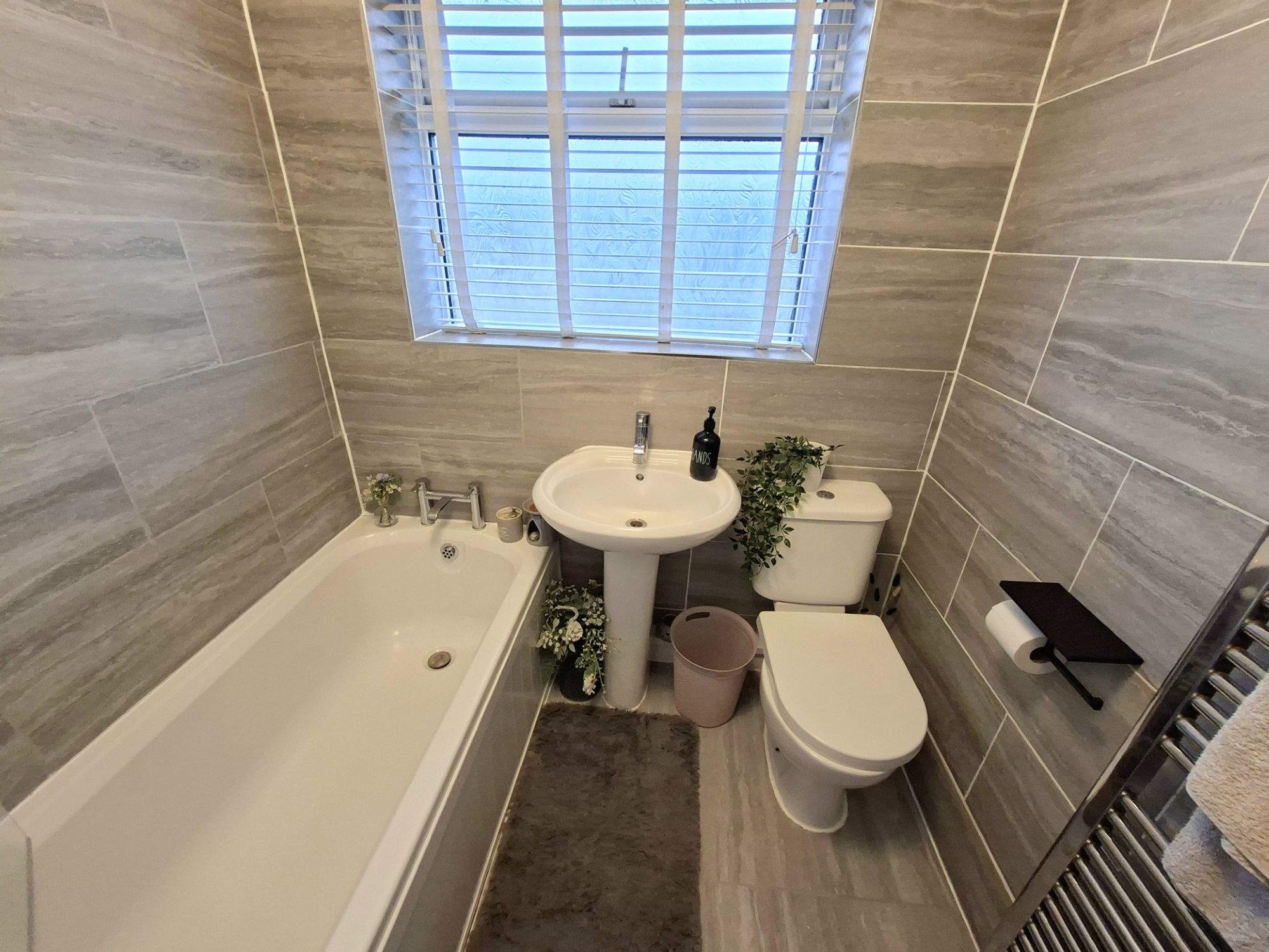 FAMILY BATHROOMA modern family bathroom with a stylish 3-piece suite, floor to ceiling tiled walls and a wood effect laminate floor.