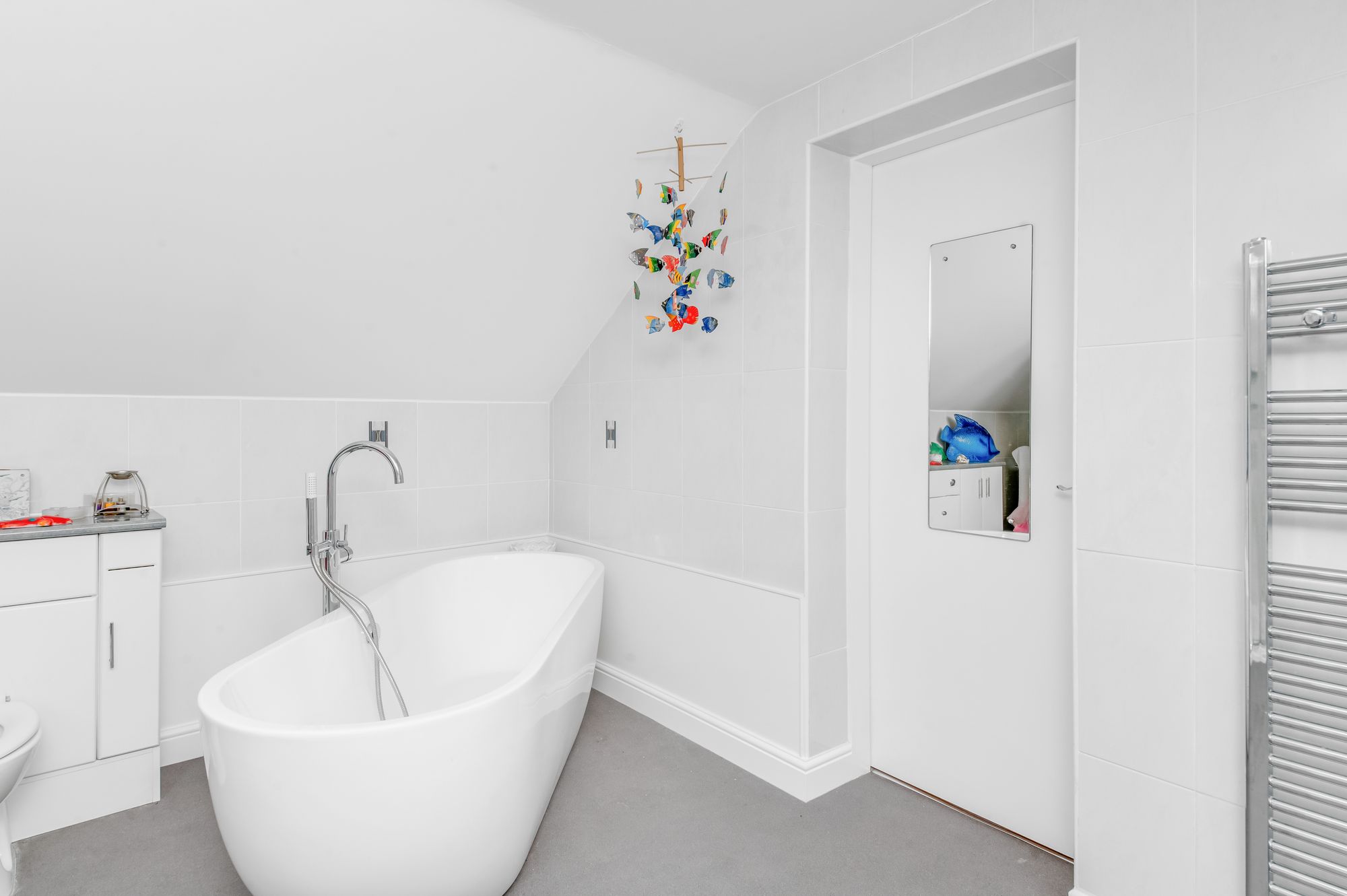 FAMILY BATHROOMA modern family bathroom comprising of a five-piece suite in the form of; low flush W.C, twin wash hand basins sat within vanity units with chrome mixer taps over, shower cubicle with mains fed shower within and free-standing bath with handheld shower attachment. The room has inset ceiling spotlights, full tiling to walls and floor, extractor fan, bank of vanity units, two chrome towel rails / radiators and two Velux skylights.
