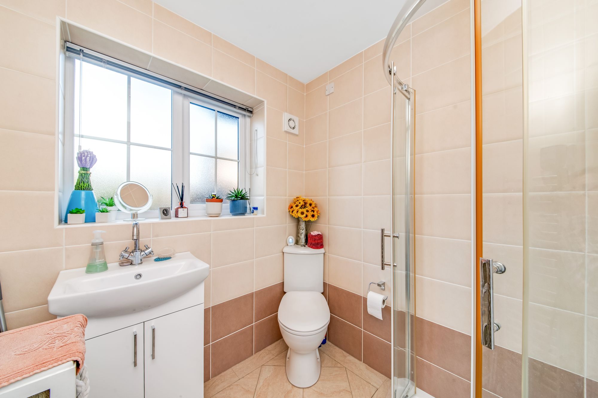 BATHROOMComprising of a four-piece suite in the form of close coupled W.C, twin wash hand basins with chrome mixer taps over and shower cubicle with waterfall effect shower head and separate handheld attachment. The room has inset ceiling spotlights, extractor fan, full tiling to walls and floor, access to storage cupboards, access to eaves storage, antique style chrome radiator and obscure uPVC double glazed window.