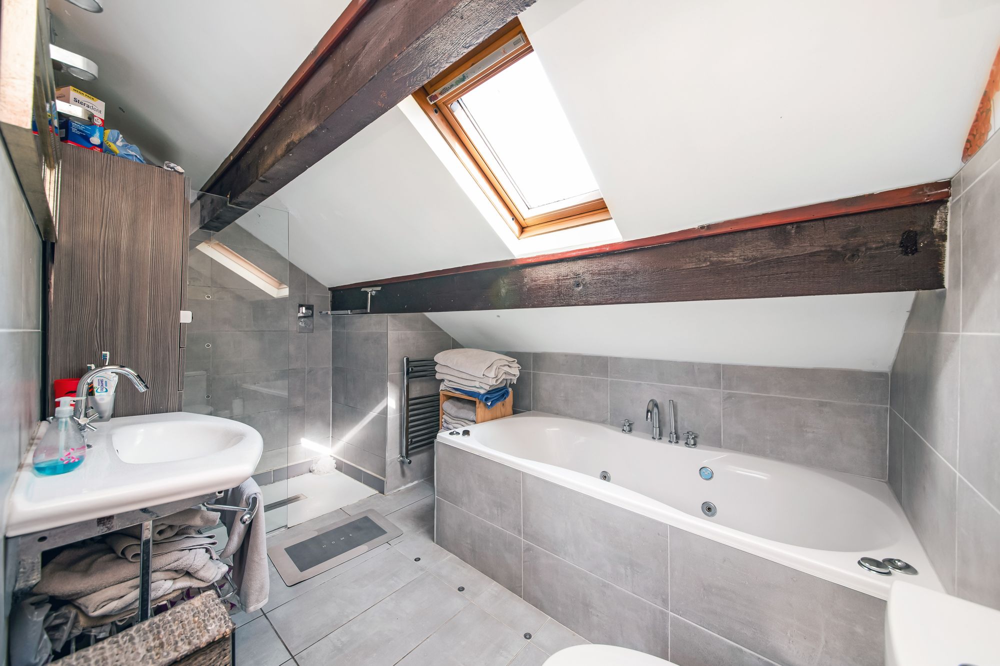 EN-SUITE BATHROOMComprising a four piece white suite in the form of close coupled W.C., basin with chrome mixer tap over, jet bath with chrome mixer tap over and shower attachment and walk in shower with mains fed chrome mixer shower within. There are wall lights, exposed timbers, part tiling to wall, tiled floor with LED lighting and a Velux skylight. A door in turn then leads to Bedroom One.
