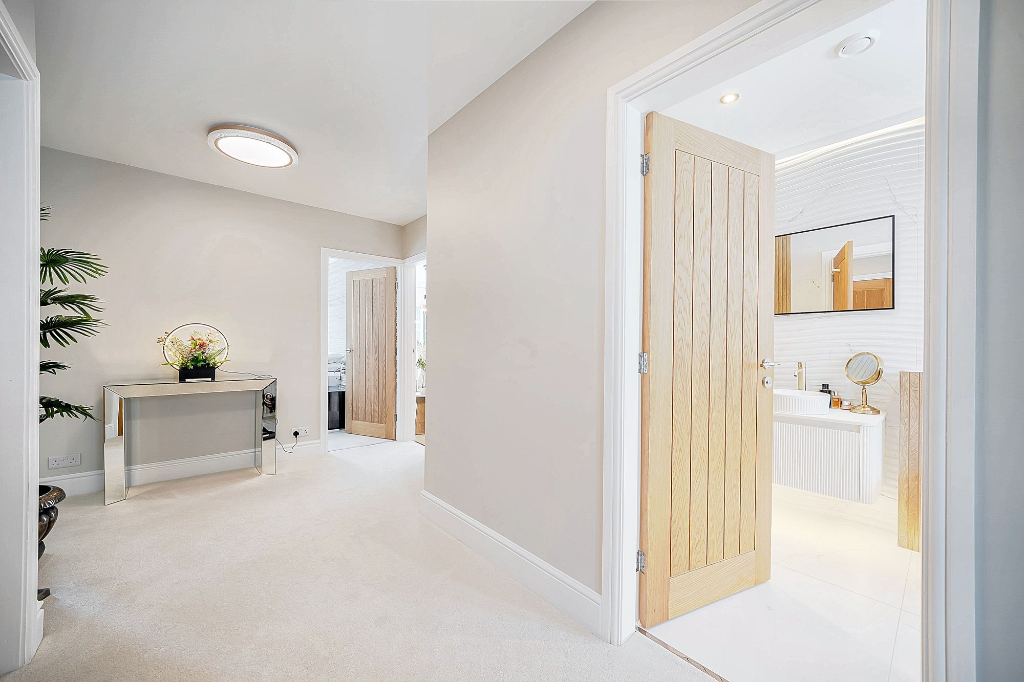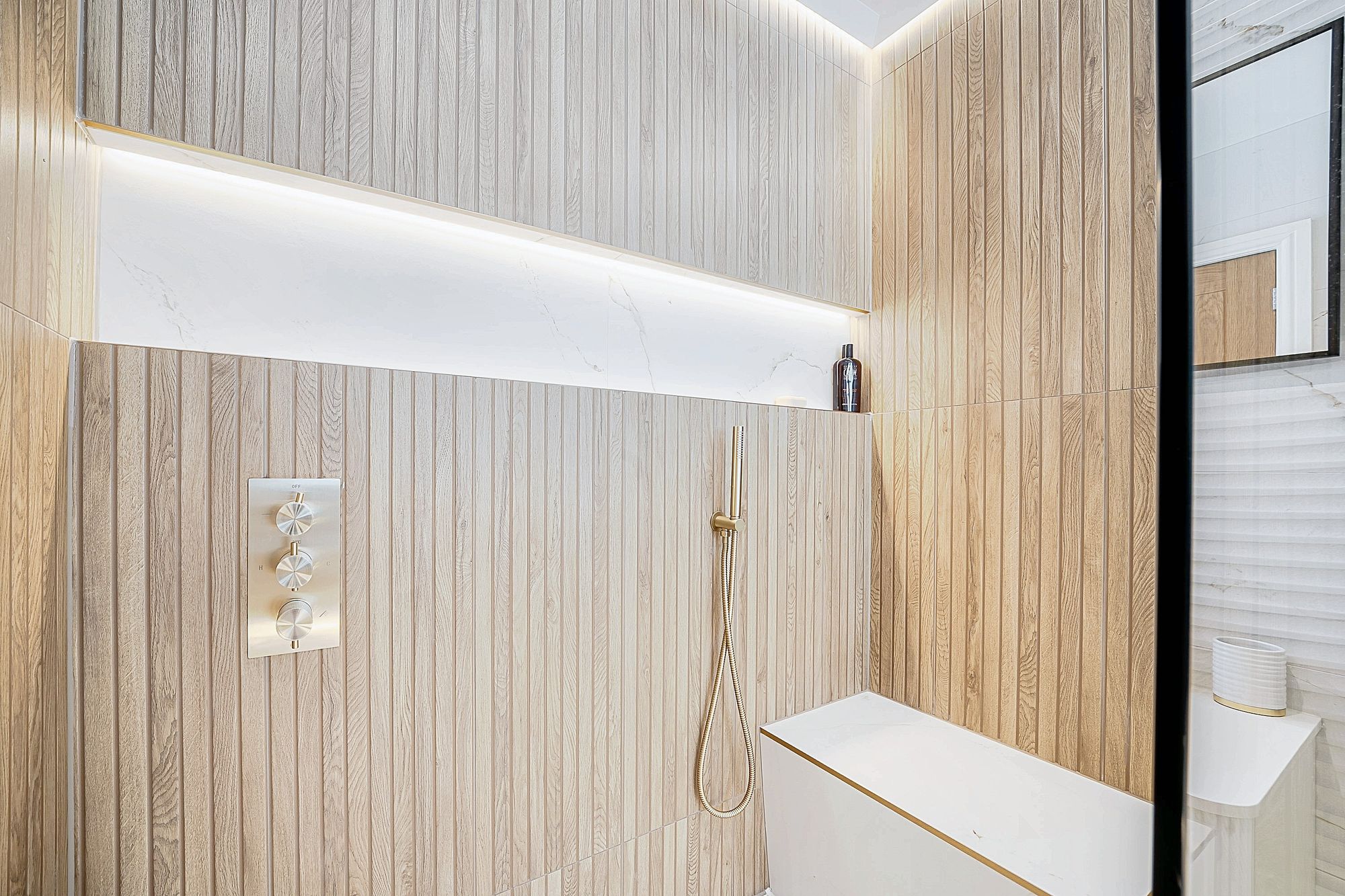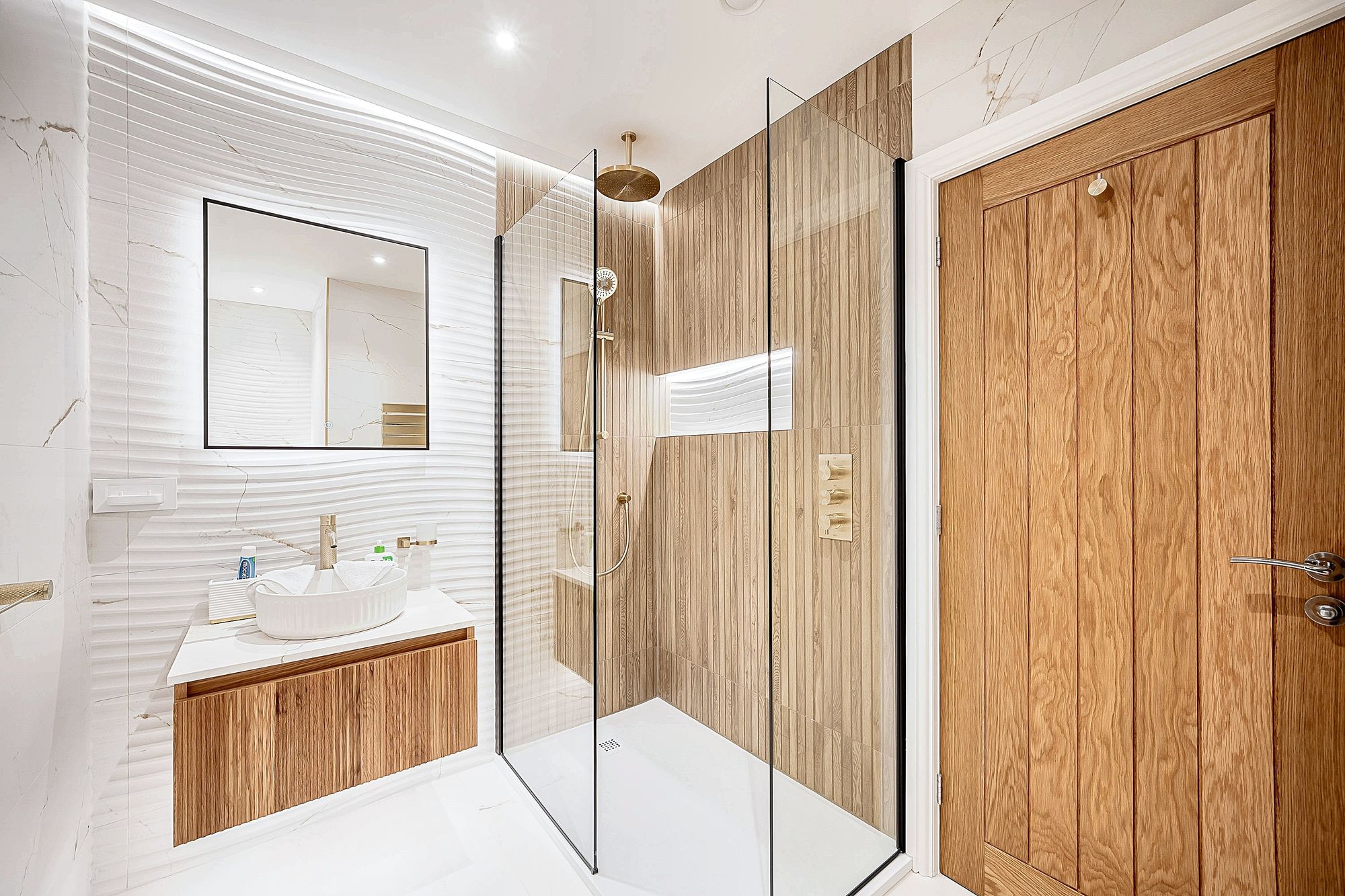 With inset LED downlighters, extractor fan, low level automated light, floor to ceiling tiled walls, tiled floor with underfloor heating, heated towel and fitted with a suite comprising wall hung vanity unit mounted with a circular hand wash basin with monobloc tap , wall mounted toothbrush charger, low flush w.c. with concealed cistern and large walk in shower with glazed panels and timber effect tiling, there is concealed LED lighting and shower fitting including fixed shower rose and separate hand spray.