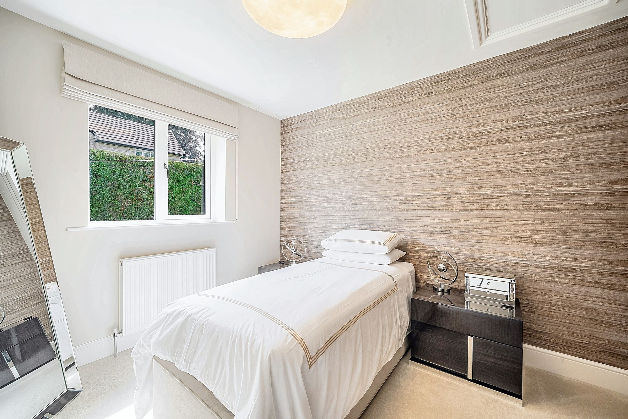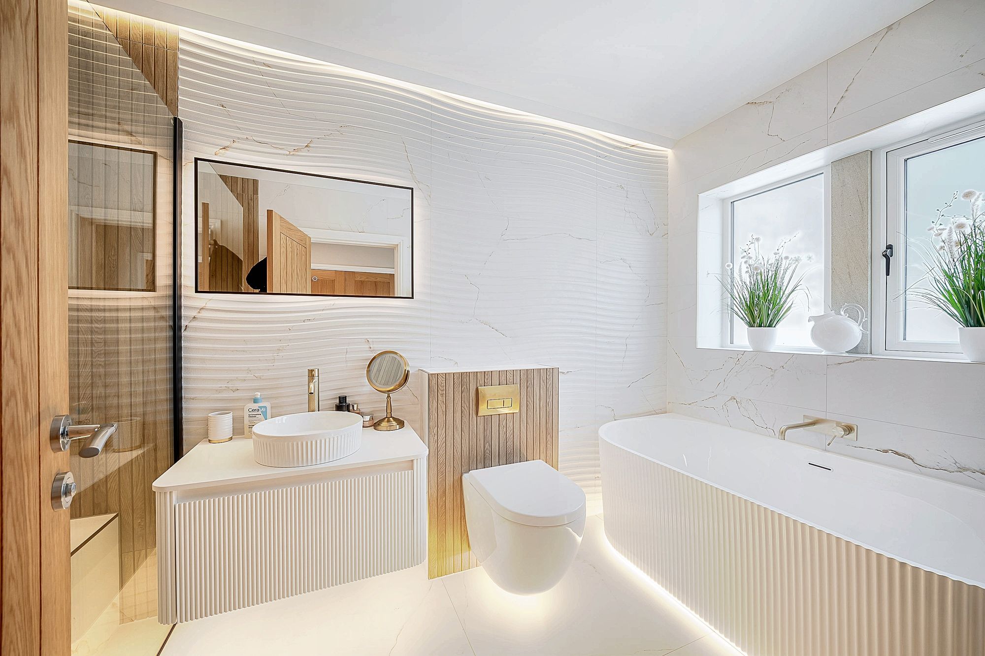 With a frosted pvcu double glazed mullioned window, there are inset LED downlighters, extractor fan, concealed LED lighting, floor to ceiling tiled walls, tiled floor with underfloor heating, heated towel rail and fitted with a four piece suite comprising fluted bath with low level LED lighting and monobloc tap, wall hung vanity unit mounted with a circular hand wash basin with a free standing monobloc tap and a movement sensor light beneath together with a back lit mirror above, low flush w.c. with concealed cistern and large walk in shower with glazed side panel, timber effect tiling with tiled floor and having a fixed shower rose, separate hand spray and fitted seat.