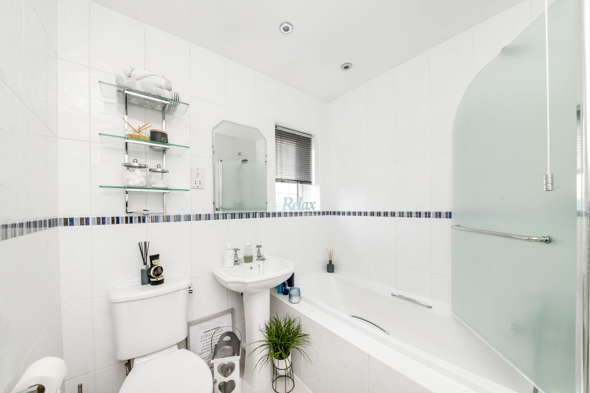 The bathroom features a white, three-piece suite comprising an inset bath with showerhead mixer tap and thermostatic shower over with obscure glazed shower guard and tiled inset, a pedestal wash hand basin, and a low-level WC. There is tiled flooring, tiling to the walls, inset spotlighting to the ceiling, a double-glazed window with obscure glass to the front elevation, a shaver point, a chrome ladder-style radiator, an extractor fan, and a useful airing cupboard which houses the hot water cylinder and provides extra storage for toiletries and towels.