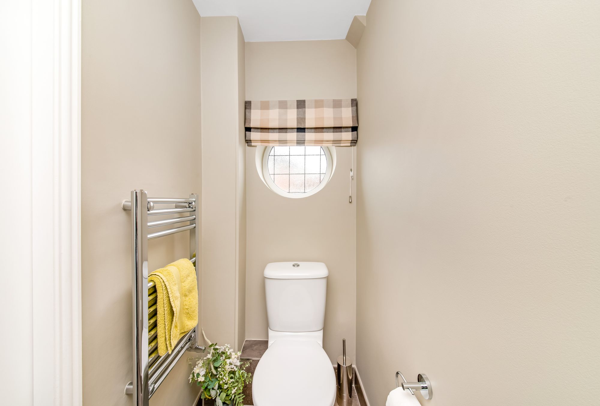 The WC features a modern, white, two-piece suite comprising a low-level WC with push-button flush and a pedestal wash hand basin with attractive tile splashback and chrome monobloc mixer tap. There is contrasting tile flooring and matching skirting, a circular porthole style window with double-glazed insert and leaded detailing, a chrome ladder-style radiator, inset spotlighting to the ceiling and an extractor fan.