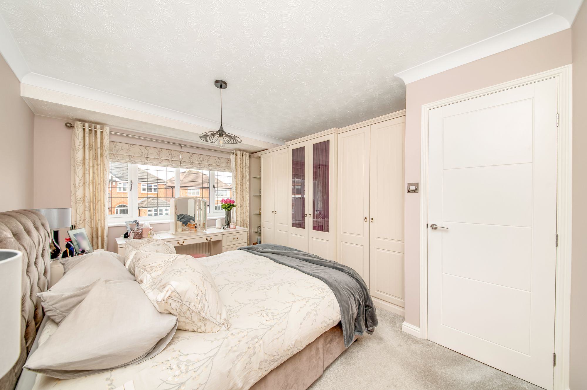 Bedroom one is a generously proportioned, light and airy double bedroom with ample space for freestanding furniture. There is decorative coving to the ceiling, a ceiling light point, a radiator, and a bank of fitted wardrobes with hanging rails, shelving and glazed display shelving in situ. A door leads into the en-suite shower room.
