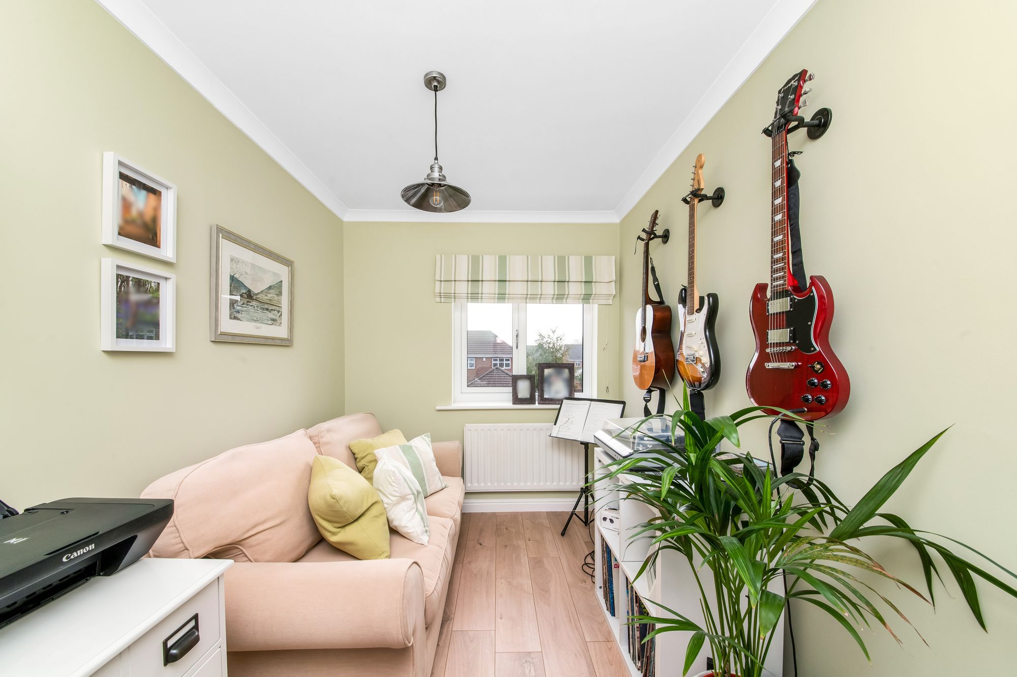 Bedroom three is currently utilised as a home office/snug but can accommodate a double or three-quarter bed with space for freestanding furniture. There is high-quality flooring, a radiator, decorative coving, a ceiling light point, and a bank of double-glazed windows to the rear elevation.