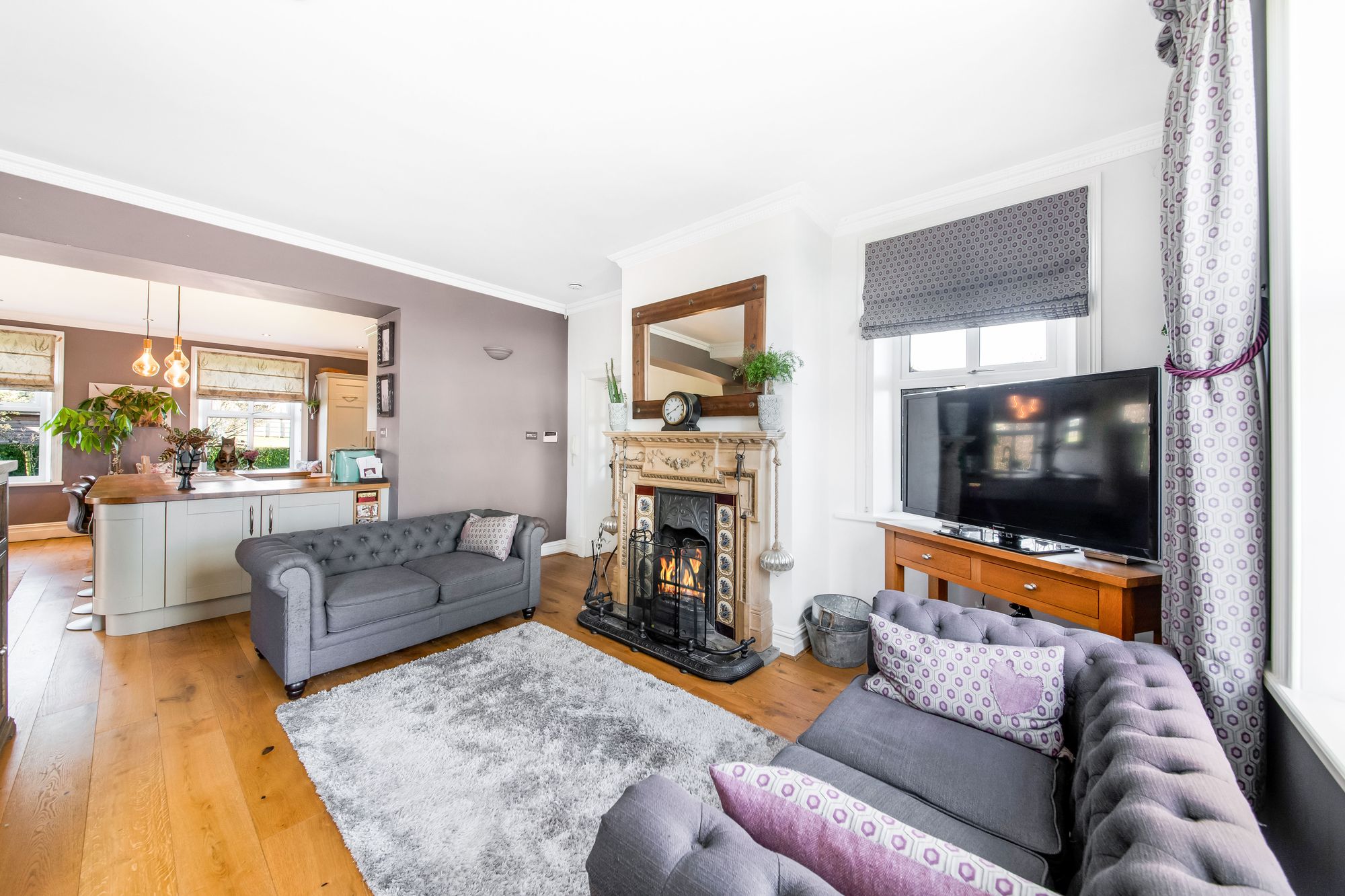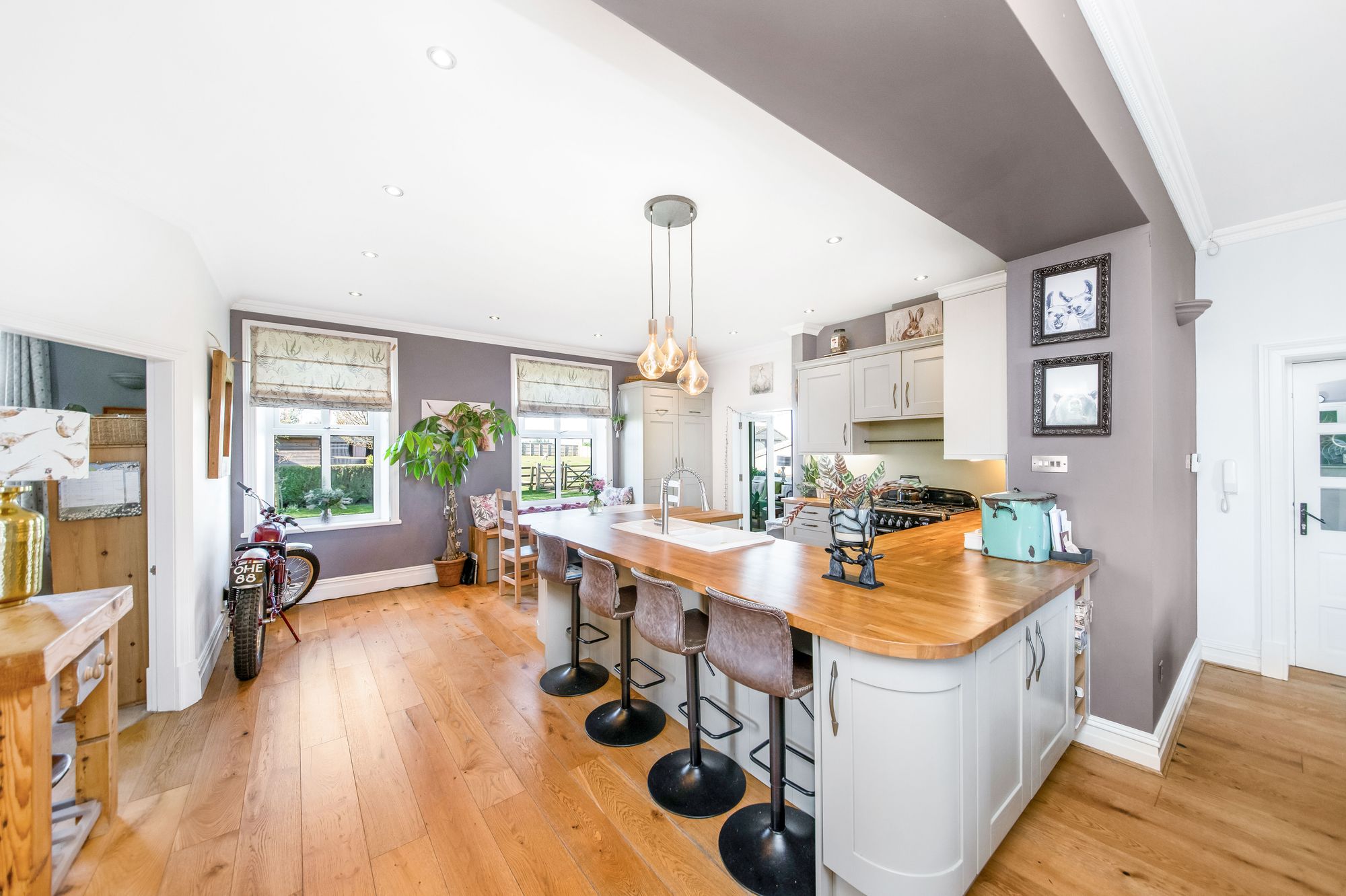 DINING LIVING KITCHENTimber and glazed door from the entrance hall to the magnificent dining living kitchen. This room is the through depth of the house and has two windows to the front giving beautiful views out over the gardens and beyond and two windows to the rear giving delightful views out over the property’s gardens and paddock. The room as the photographs suggest, is beautifully decorated and presented, there is a further window to the side, a beautiful broad chimney breast to the living area which has a most delightful and ornate fireplace of a period design with an open fired grate and period design tiled side panels. There is oak flooring running throughout the room, a variety of lighting points including spotlighting and chandelier point over the fabulous kitchen area.
