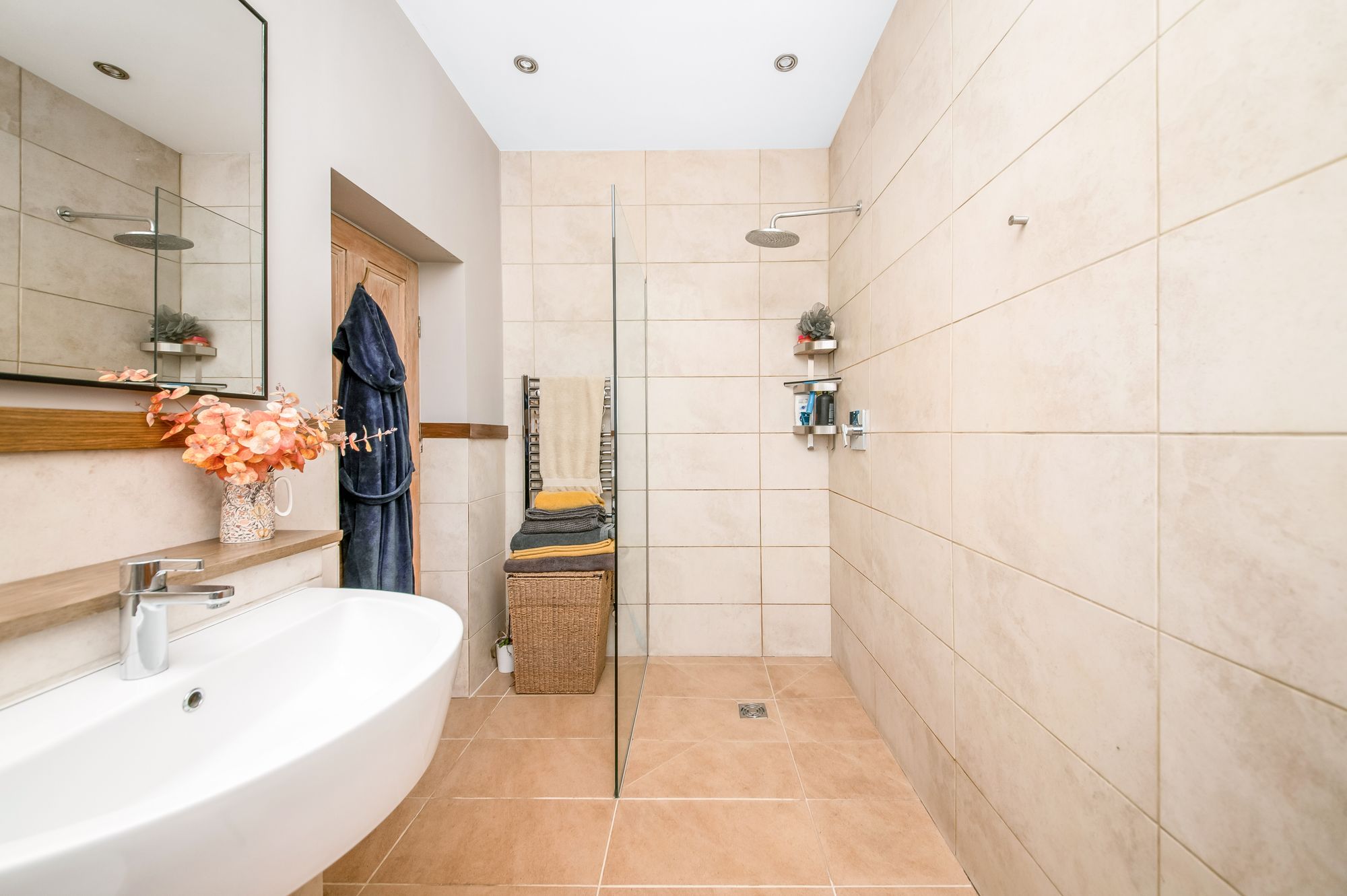 BEDROOM ONE EN-SUITEWith a window enjoying the views to the garden and beyond. There is a ceramic tiled floor, ceramic tiling to the full ceiling height where appropriate, inset spotlighting, fixed glazed screen wet room shower with high quality fittings, stylish wall mounted wash hand basin and concealed cistern W.C.