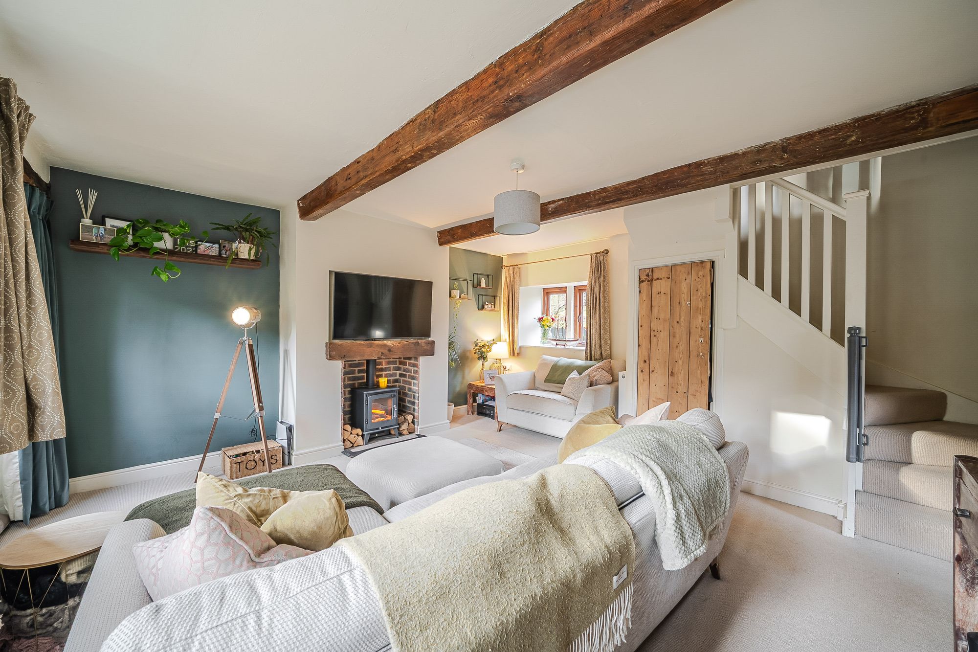 As the dimensions indicate this is a well-proportioned and characterful reception room which has a beamed ceiling, a bank of stone mullioned timber and sealed unit double glazed windows with oak lintel, adjacent to this there is a timber panelled and glazed door with stone surround and oak lintel, two central heating radiators, recessed storage cupboard and shelving and as the main focal point of the room there is a chimney breast with oak mantle, above the mantle there is a recess for mounting a flat screened tv and housed within the chimney breast there is an electric flame effect stove which rests on a stone flagged hearth. To one side a spindled return staircase rises to the first floor with a useful storage cupboard beneath.