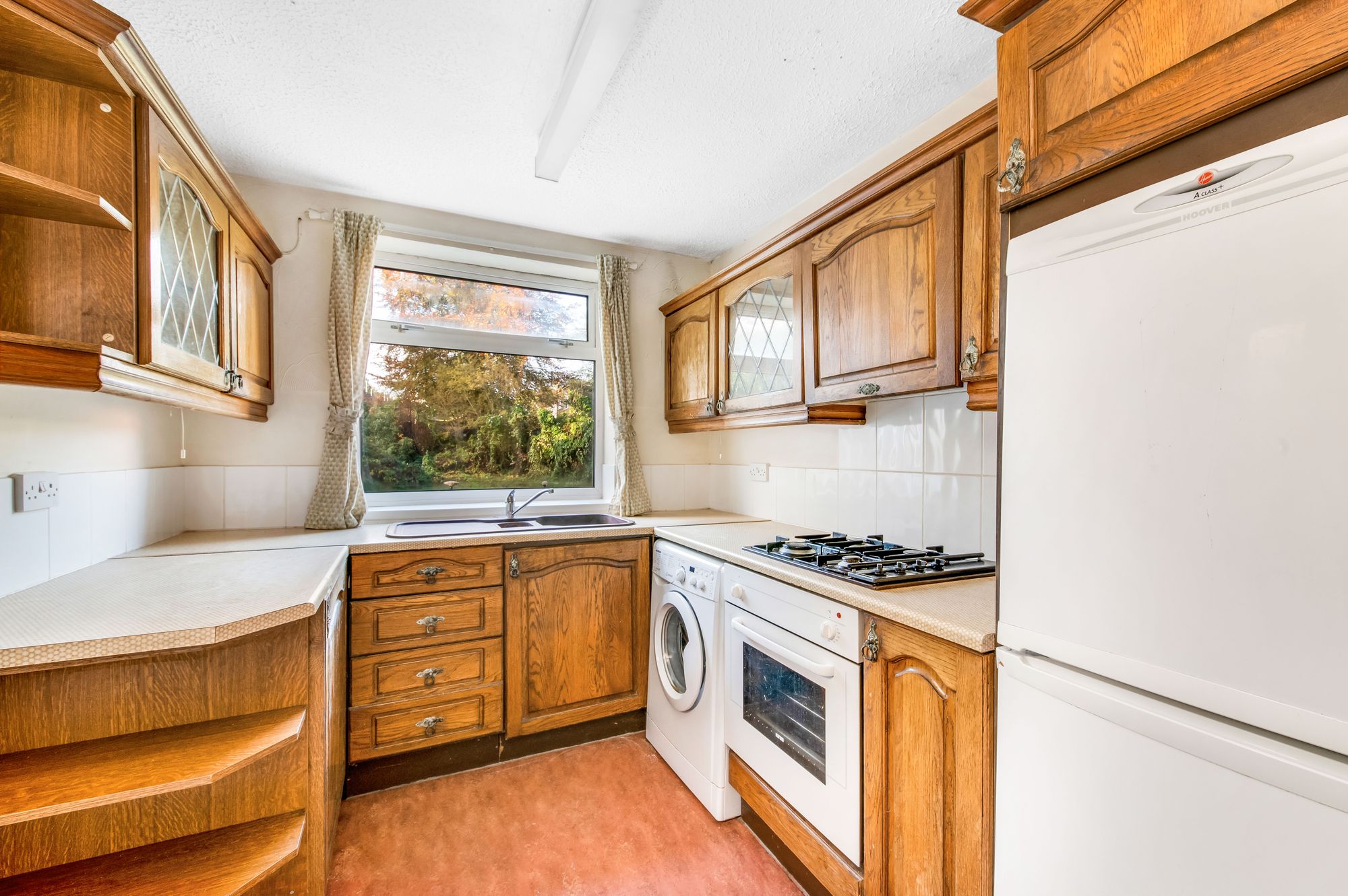 Located to the rear elevation, the dining kitchen enjoys natural light and a pleasant outlook over the garden. The kitchen is fitted with a range of base and wall units, together with a gas hob, oven, fridge freezer, and automatic washing machine. There is a central heating radiator and two ceiling light points. A side door provides access to the driveway, while a pantry area houses the property’s meters and boiler. A further doorway leads into the garden room, which offers additional space and enjoys views of the rear garden.
