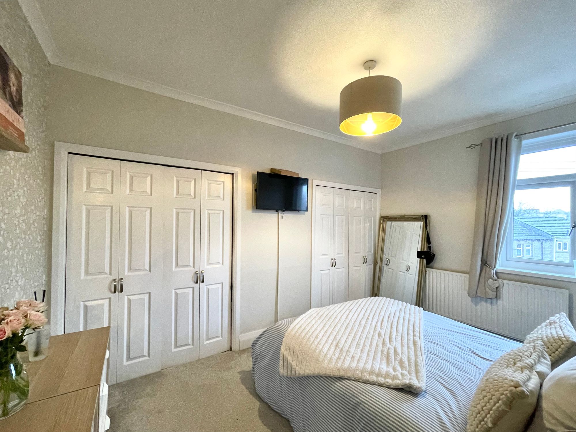 A good-sized double room with uPVC double glazed window looking out over the front garden and enjoying a pleasant aspect beyond. There is a ceiling light point, ceiling coving, central heating radiator and to either side of the chimney breast there are fitted wardrobes.